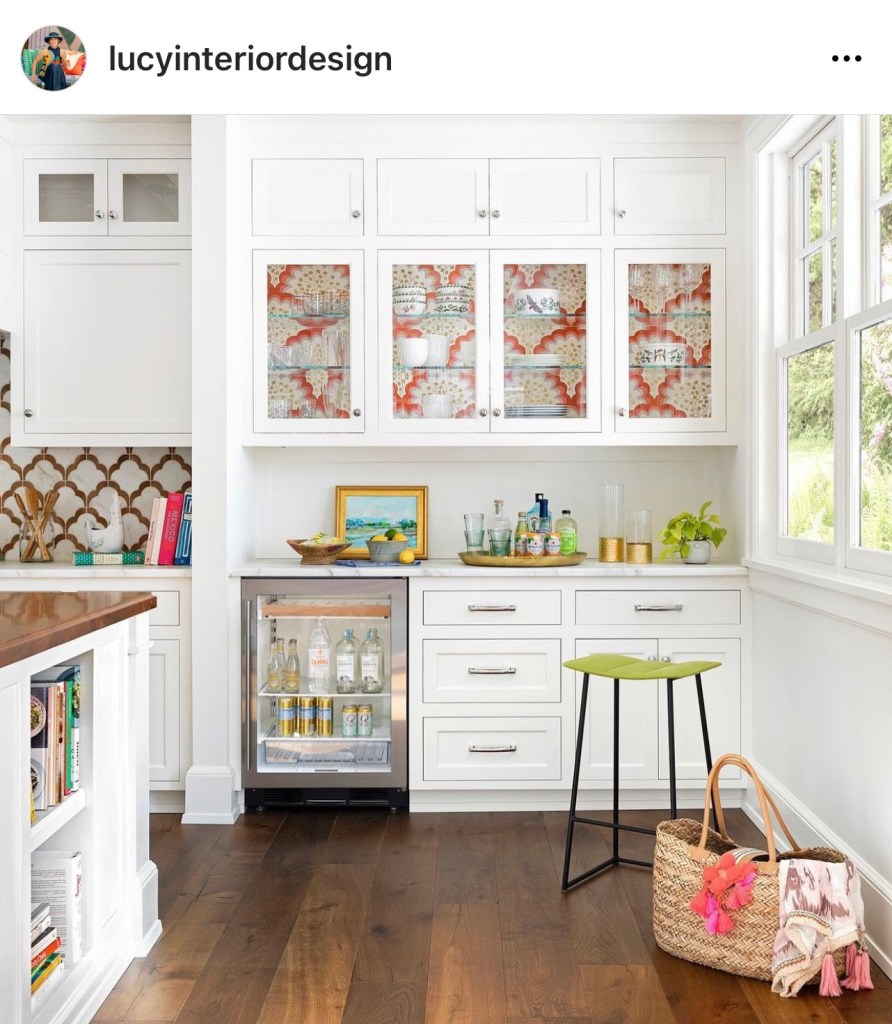 Kitchen inspo – classic white cabinets with that stunning wallpaper lining the cabinets and the complementary tile!