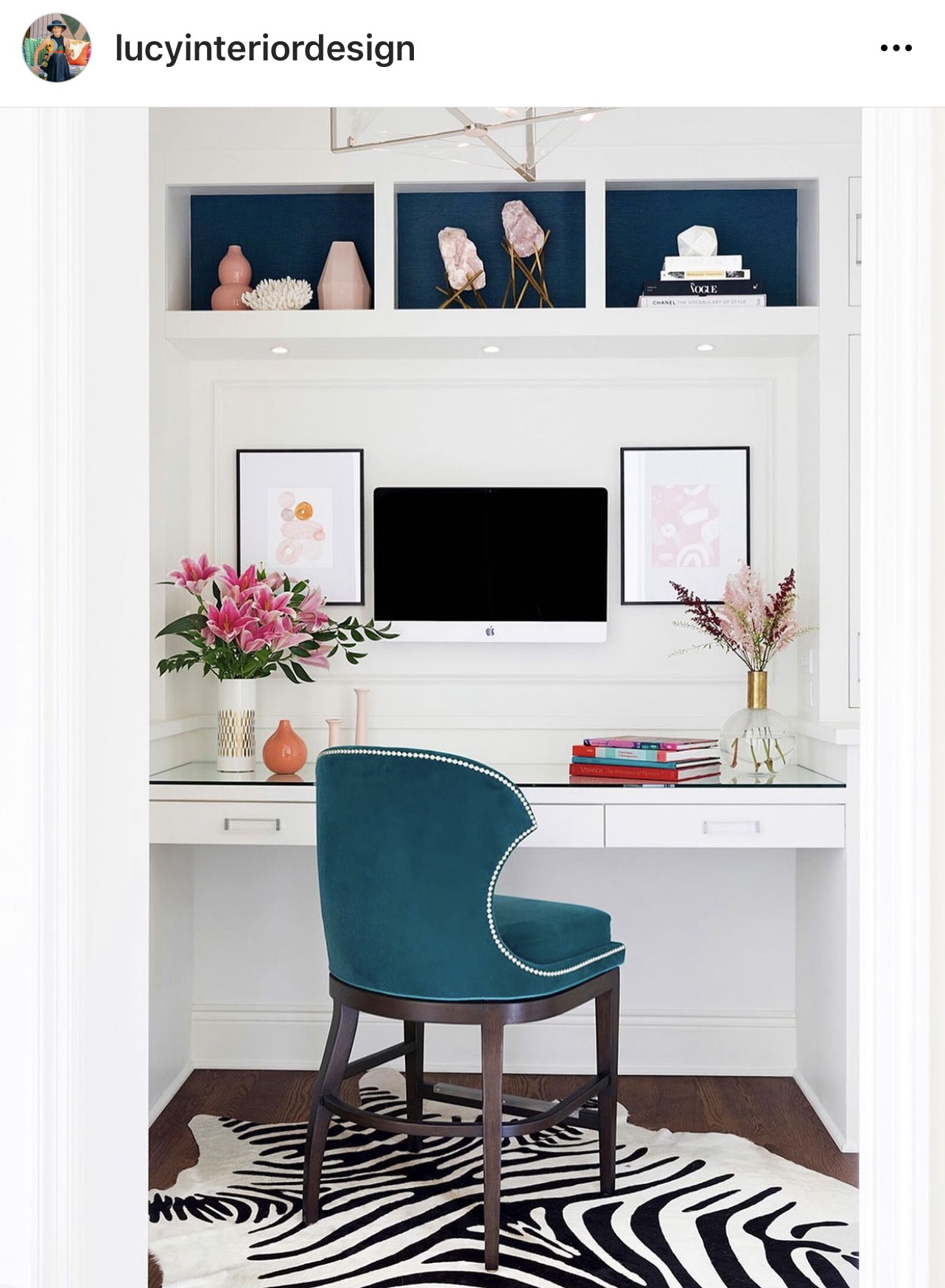 Lots of warm white, but the teal at the back of the cubbies, paired with the teal chair, with the touches of pink in the art and flowers… you can see why I am in love! Definitely office goals!