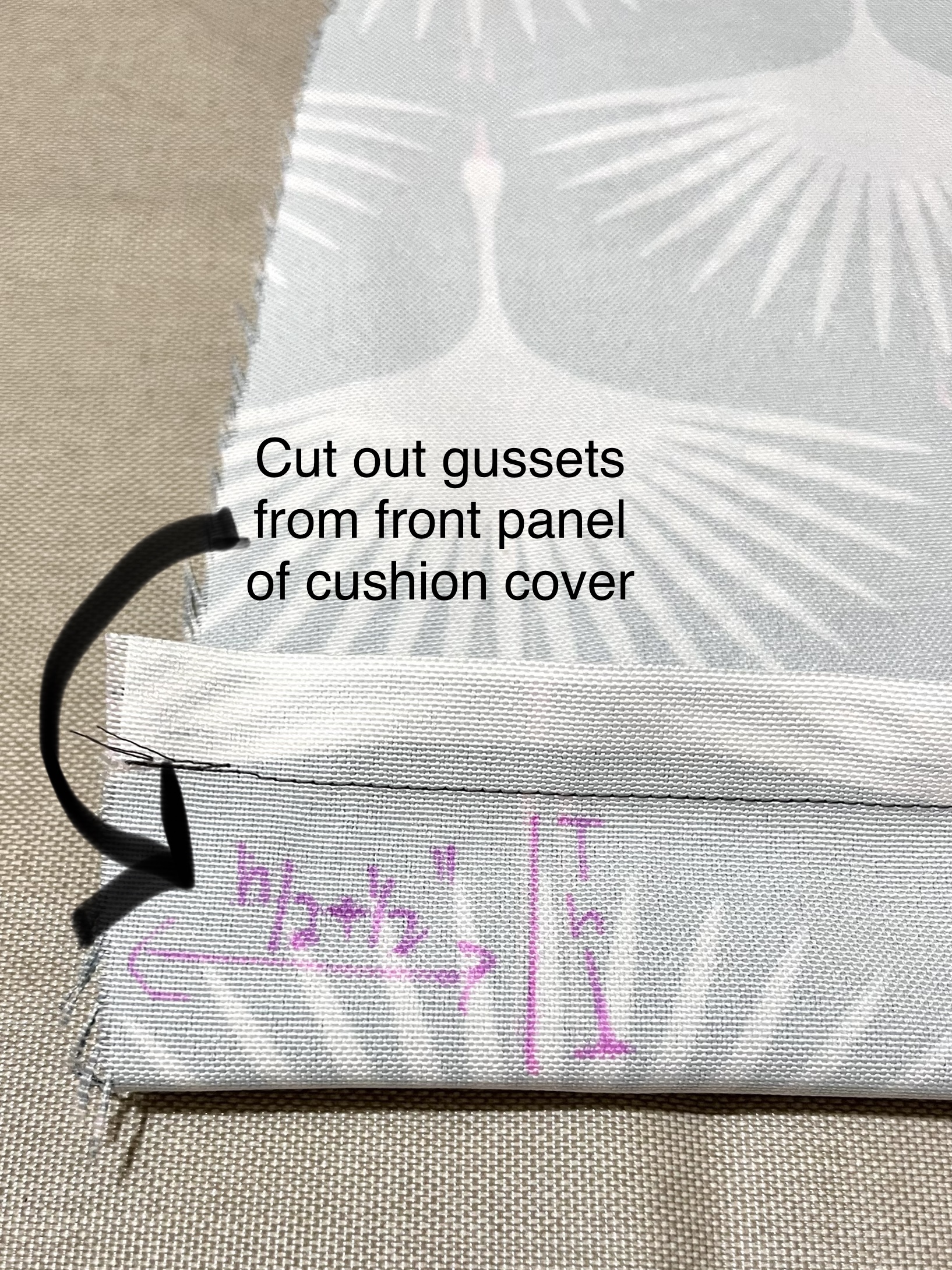 Assemble your cushion cover: Once you cut out the fabric according to this pattern, you can finish by following the instructions in the video: basting the back seam, installing the zipper, opening the back seam, sewing the side seams, and finally sewing the gussets. I zigzagged all the inside seams to prevent fraying.