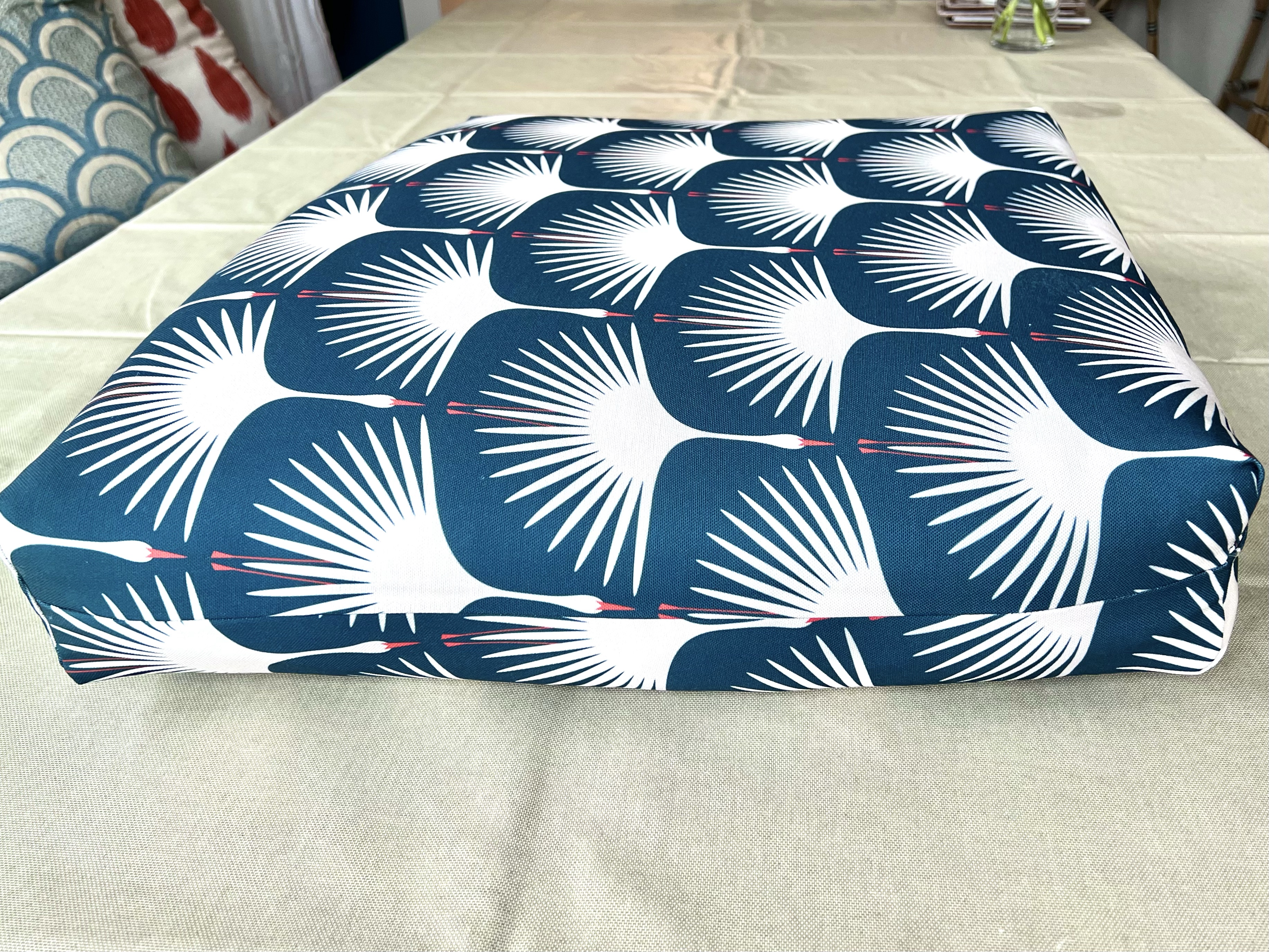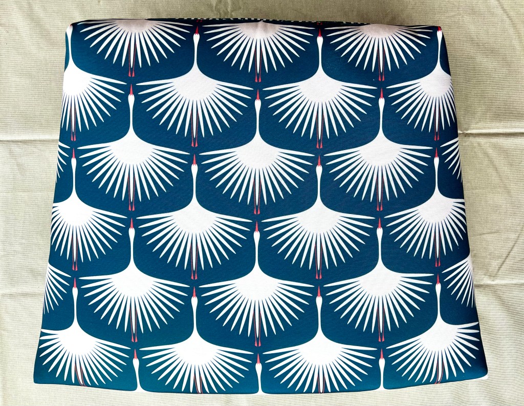 Choosing your fabric: I love the Art Deco Swans pattern by Kate Rhees that I found on Spoonflower. She has many gorgeous colors and sizes in this pattern. A directional pattern makes sewing this a bit more tricky, and the sides and back are not as pretty, but you can’t see them when the cushion is on the chair, so it worked out alright. I used the outdoor recycled canvas for durability.