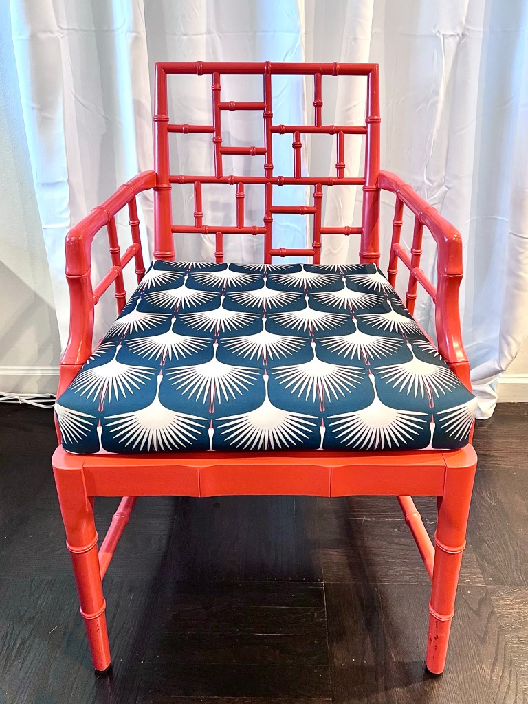 We moved twice in the last two years, and in the process, I gave away a lot of things. I feel like the universe has decided to reward me by sending me two great finds. First, I found this vintage Thomasville bedroom set on Craigslist that I used to make our home bar. More projects still to come from those pieces! Then, the woman who gave me that set contacted me when she was helping another client clean out an estate and shared these fabulous armchairs. The chairs needed new seats and I pushed myself to learn how to make cushion covers.