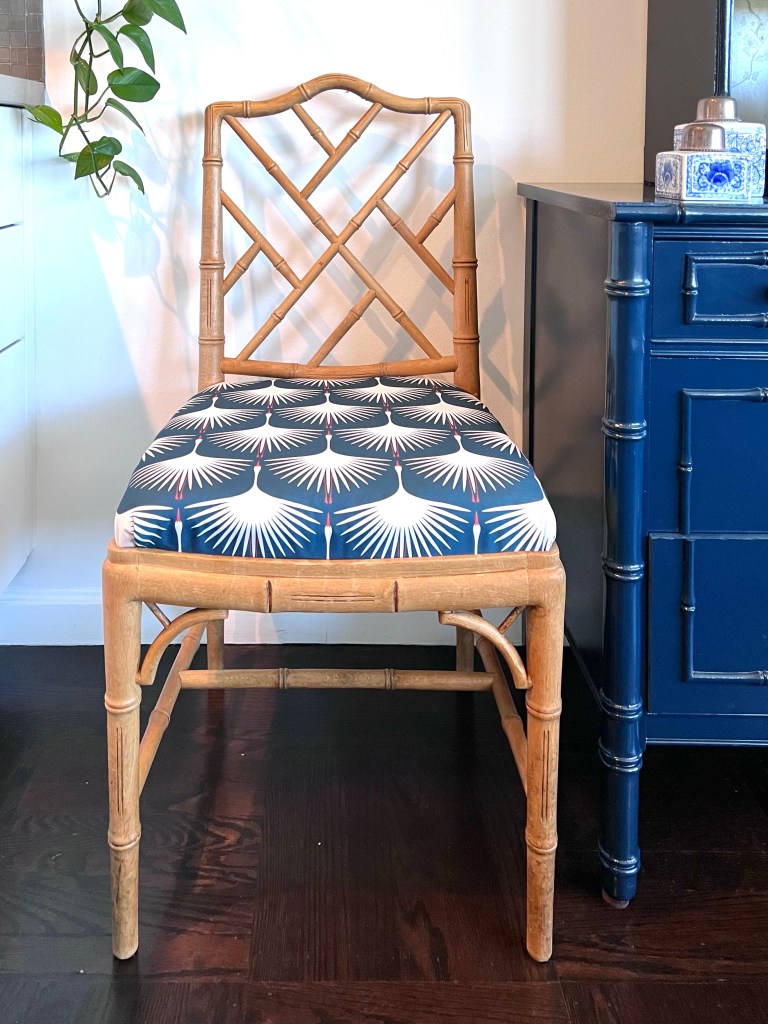 I’m mixing a vintage table and chairs, so I wanted to tie them together with the seat fabric. After much searching, I settled on the Art Deco Swans print by Kate Rhees on Spoonflower. This color coordinates with the Amy Howard “Belgian Blue” lacquer I used on the bar cabinet, as well as the navy blue bench cushions. I loved some of the lighter color options also, but in the end, I went with the darker color, so the inevitable stains won’t be as noticeable.