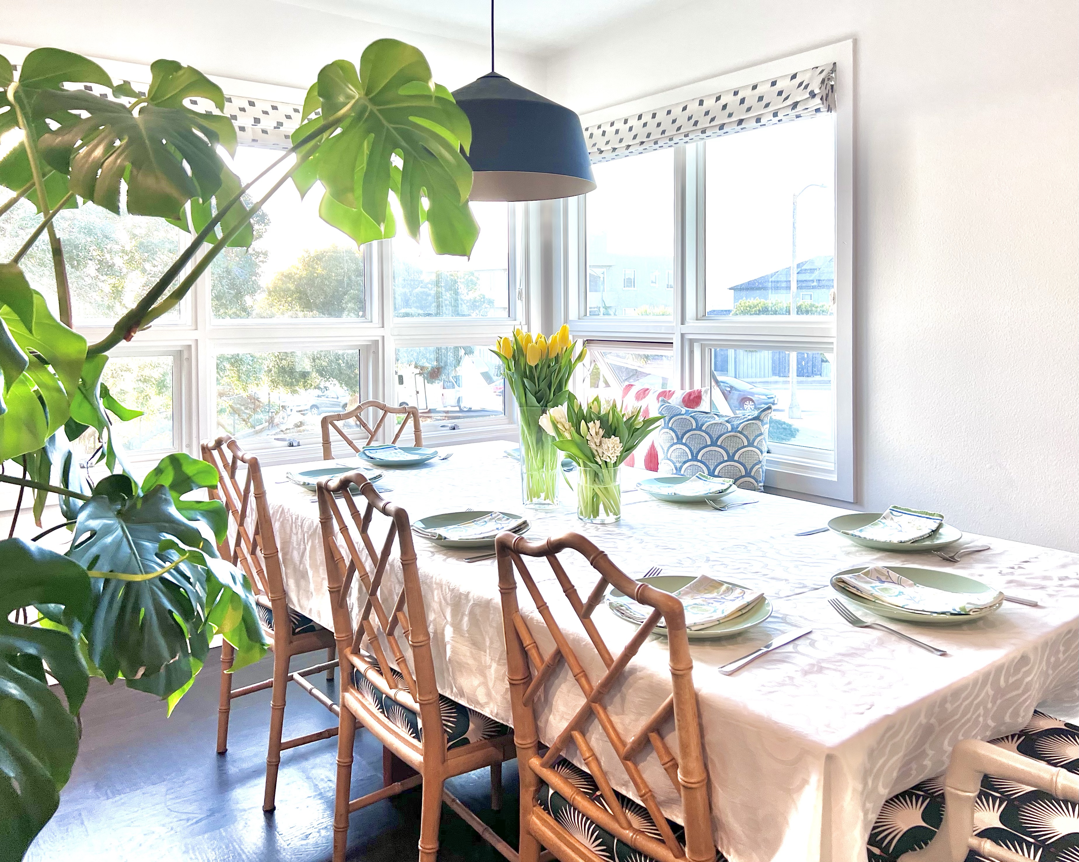 This is not a very large space, and it is open to the kitchen and living room. The light fixture was originally hung in the middle of the room, but it left a bunch of hard-to-use space around the perimeter of the room and also did not take full advantage of the windows and views. We moved the light fixture so it is centered at the windows and added bench/ banquette seating. I love how cozy and warm it feels now! I would also love a new light fixture, but I’m still trying to decide on that, so this works for now!