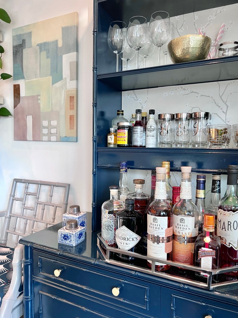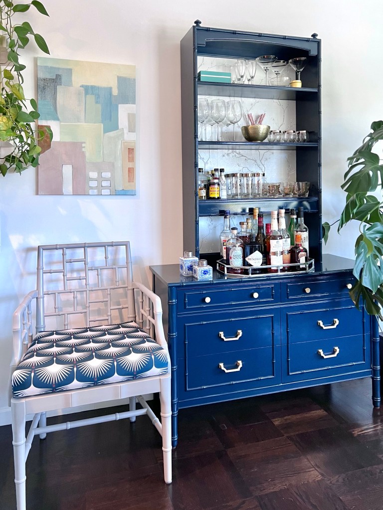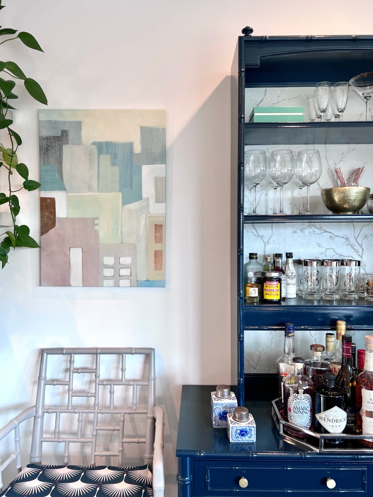 You don’t always have to make your art from scratch. I was excited to be gifted custom canvases from PhotoWall. They have sooo many options for designs, and the search functions work well, so I was able to narrow down to three special canvases for three spaces. I look forward to showing you the other two pieces I picked. This first one is in our dining room. I am in love with my vintage bar cabinet and the made-over Chippendale chair, but they felt a bit lonely on the dining room wall. I found this print – called East Side – on the PhotoWall site, and I think it ties together the space, colors, and sophisticated vibe perfectly!