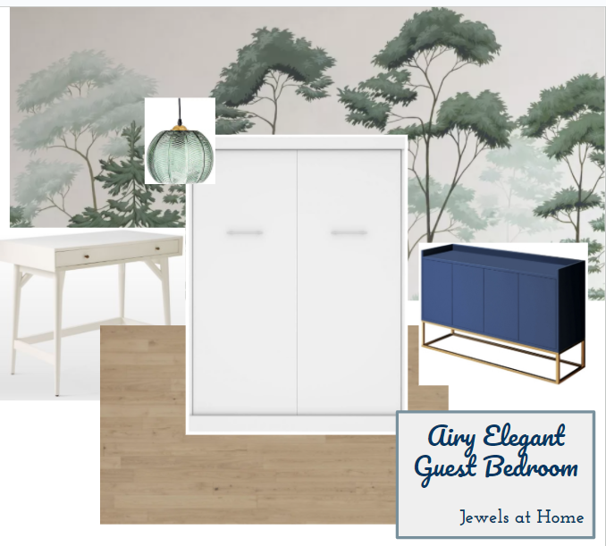 We’re waiting on permits to do a renovation adding a small guest bedroom and bathroom to our home. I’m getting excited and working on the design plans. I already shared the plan for the classic blue and white bathroom! Next up, here’s the design for the guest room. It’s going to be compact and on our lower level, so I wanted to keep the look airy and light. Of course, there’s plenty of my favorite blue and white, but I’m also really into the color green right now, so it’s fun to introduce that as well!