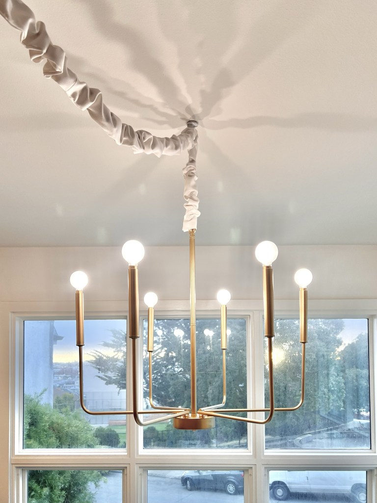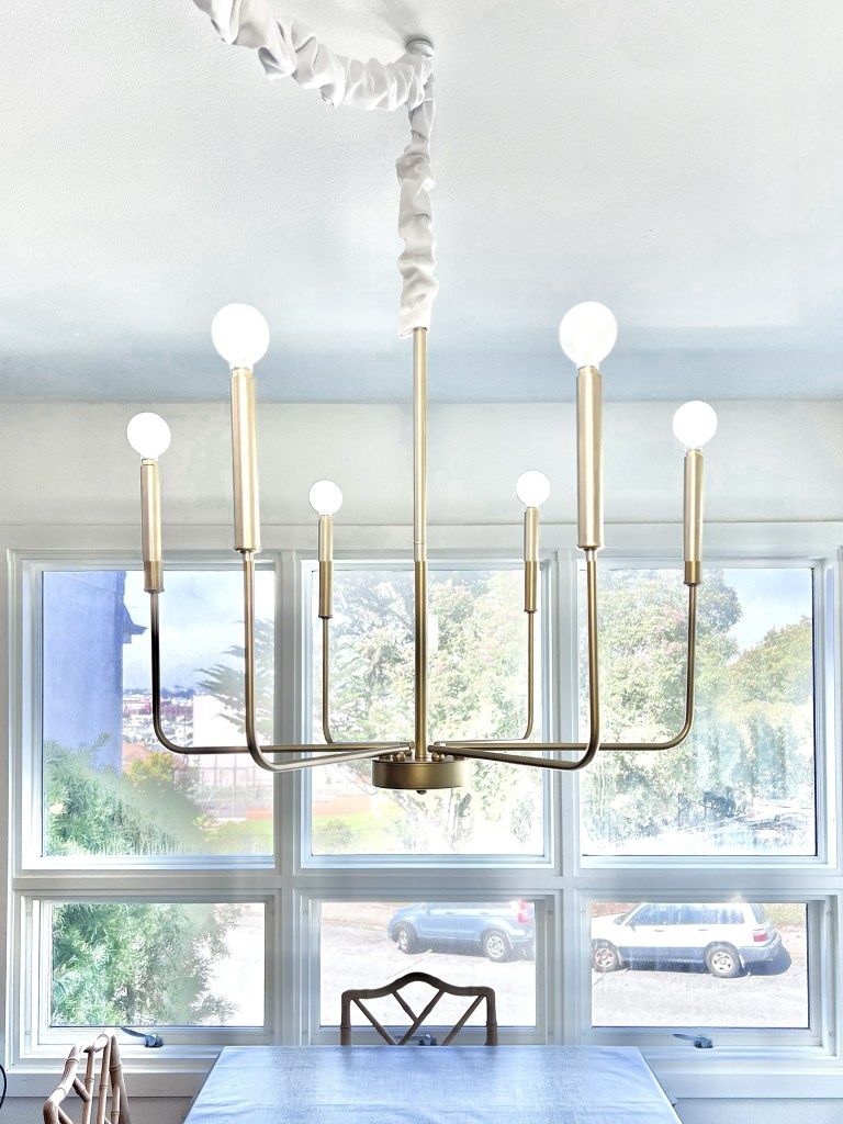Modern and classic. Elegant and streamlined. This is the balance I was looking for in a dining room chandelier. I also wanted an open design, so we could make the most of our views. This week, I will show you some of my favorite options, as well as what I ended up DIYing for ~$50! Along the way, I’ll show you my favorite gold spray paint and how to add a DIY cord cover to a chandelier.