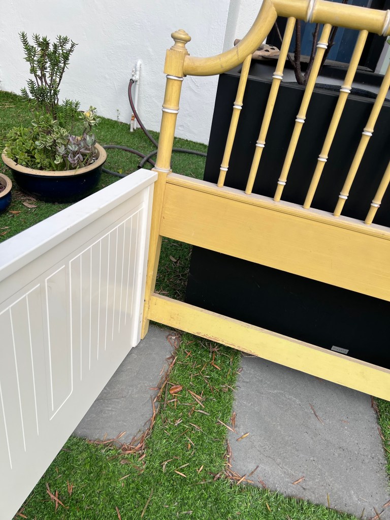The next step was figuring out how to integrate the Hemnes daybed with the Thomasville bed frame. I decided to use the two twin headboards placed side-by-side as the back of the daybed. I cut down the height of the Hemnes frame, so the two ends would be the same height as this transition in the Thomasville headboards and would serve as low armrests for the daybed and low headboard/ footboard for the bed. I also reversed the back piece of the Hemnes and removed the top trim from that piece, so that it would not compete with the vintage headboards. To make the Hemnes frame sit flush against the vintage headboards, I also had to trim a small section off the back of the “arm rests.”