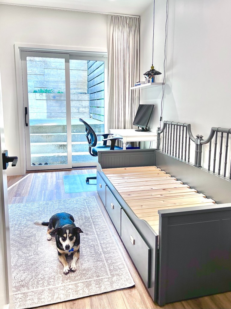 After browsing lots of options, I found the IKEA Hemnes daybed had the functionality I wanted – a daybed with storage drawers that can convert to fit one or two for sleeping. It’s made of solid wood and MDF, so it is sturdier than a lot of particleboard/ pressboard options also. I got extra lucky when I found one on Facebook Marketplace that the owner had moved from France. It turns out that the EU version of Hemnes is a little longer and narrower than the North American version, which is perfect for our long narrow room!