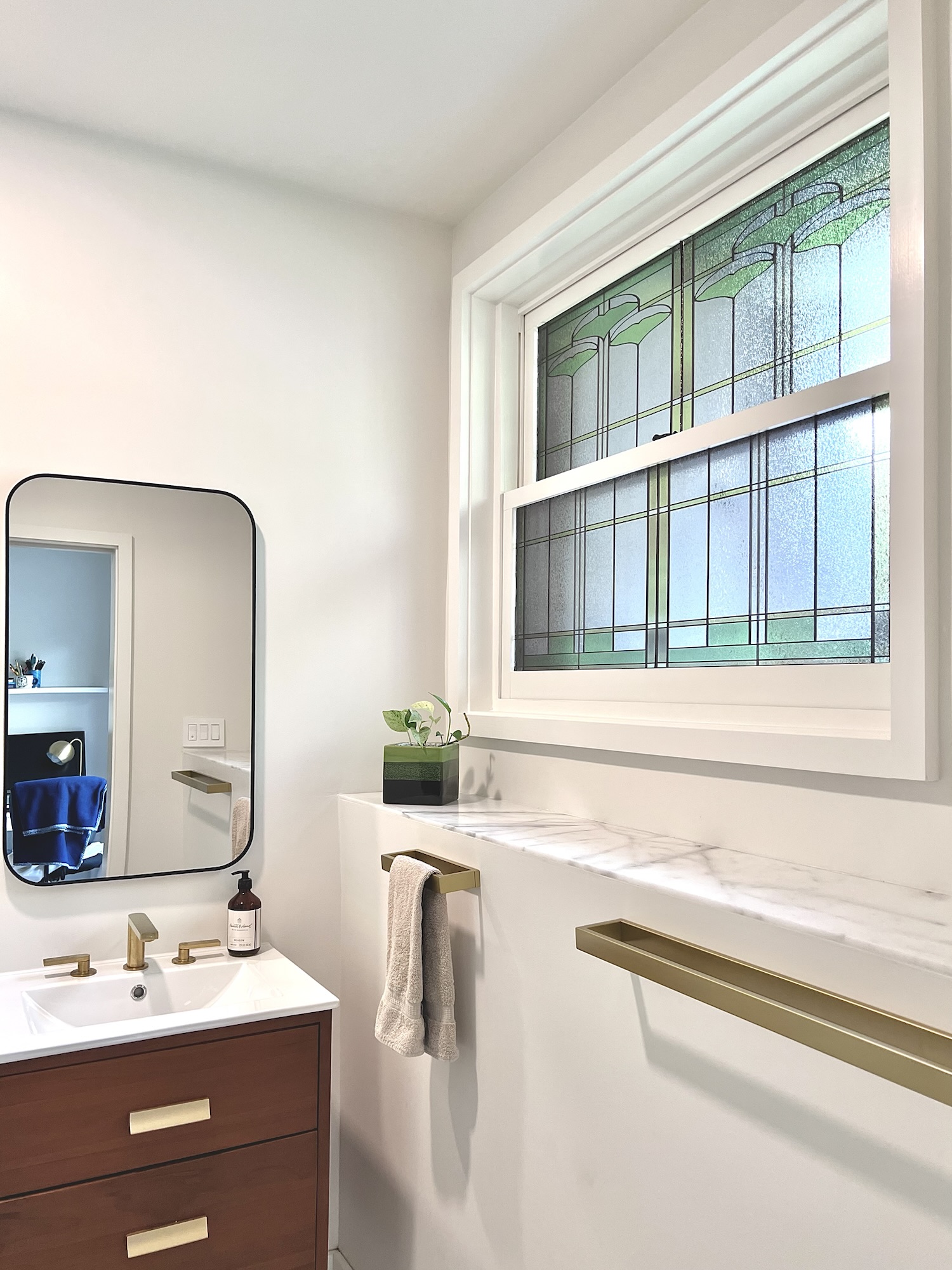 In the bathroom, I used a faux stained glass window film, which adds a more traditional style and takes up no space at all!
