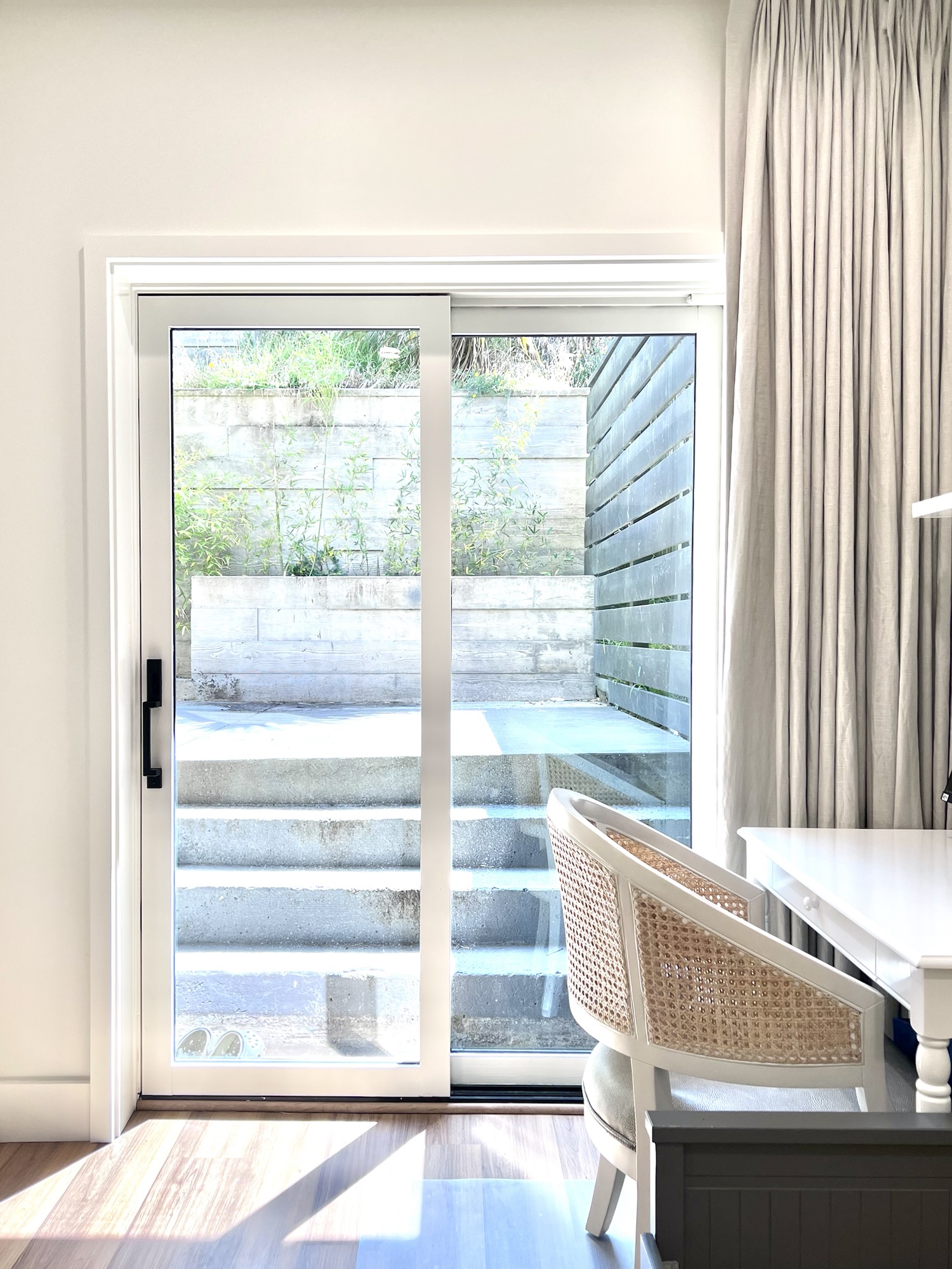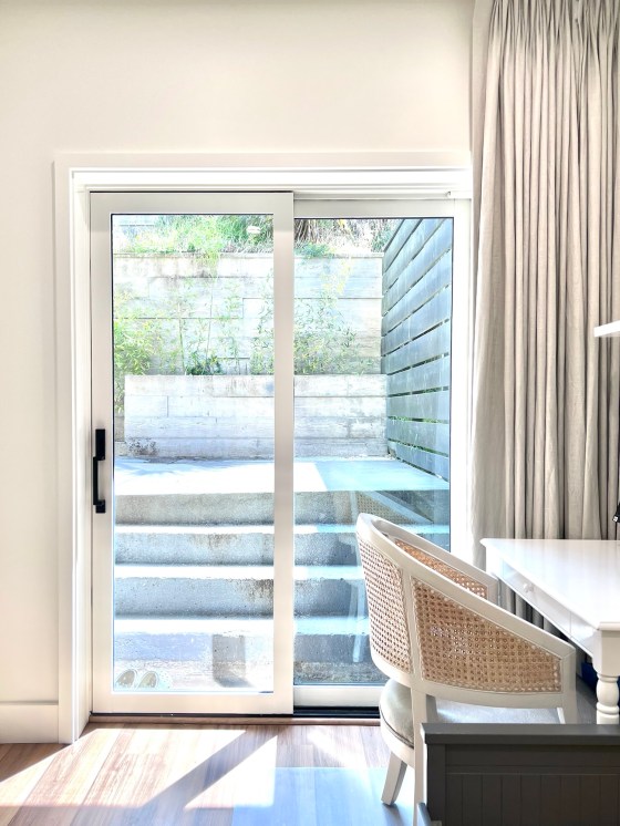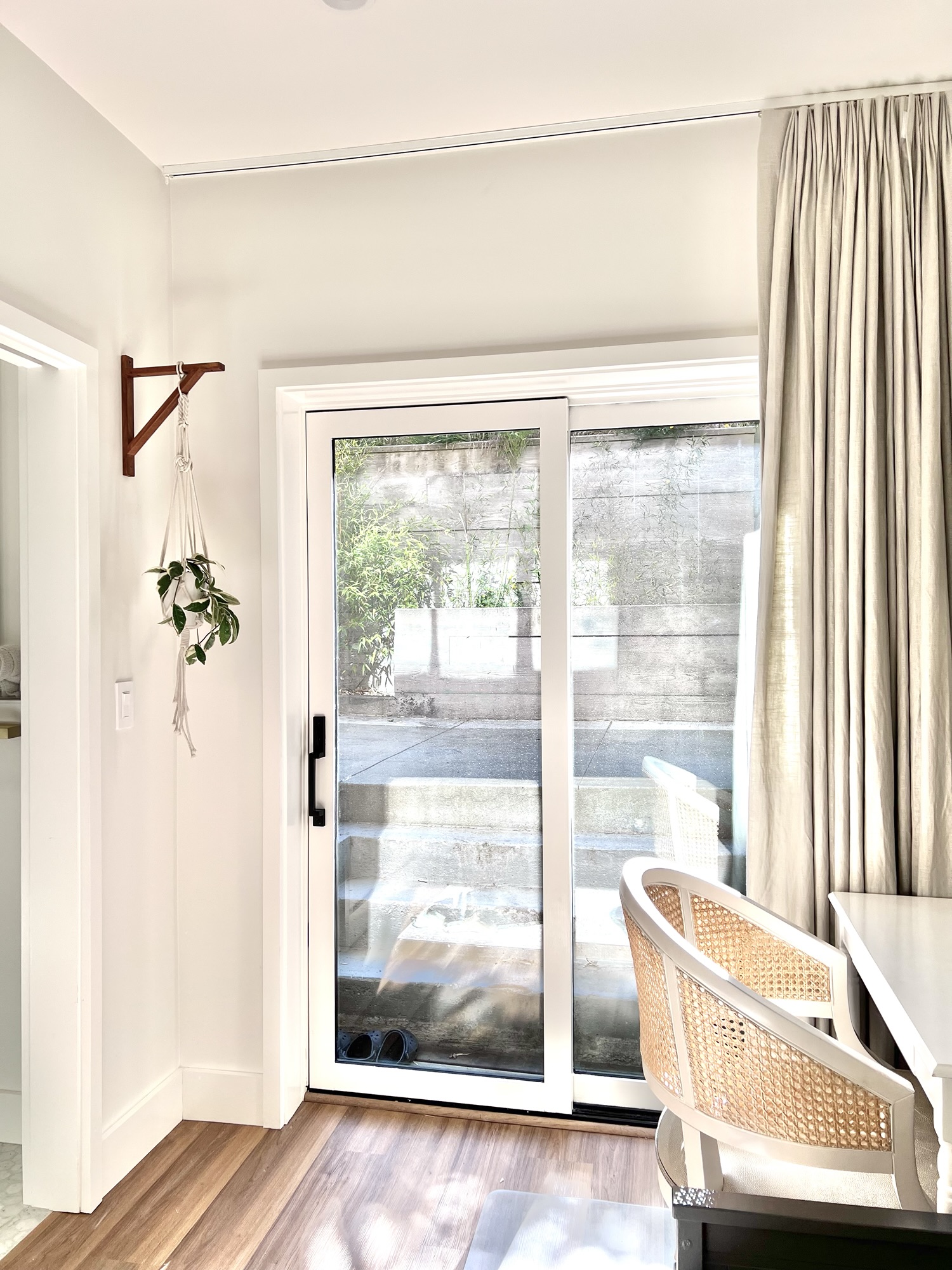There is one standard swing door in this room, which was necessitated by the construction. The rest of the doors (or lack thereof!) are chosen to make the most of our small room: no door on the closet (but make it beautiful inside!); a pocket door to the bathroom; and sliding glass doors to the patio outside.