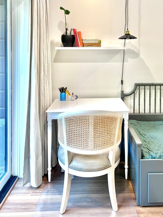 In a small room, it helps to use accessories to the ceiling or wall to save on floor space. In our new bedroom, I used a floating wall shelf, a hanging pendant light, and a hanging plant!