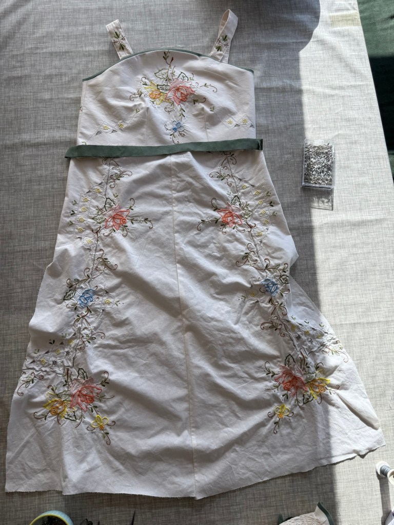 This past summer, my sister and I took some time to sort through boxes of things from our mother and two grandmothers. These have accumulated at our family house, and the experience of opening them was nostalgic, sentimental, and at times comical (think preschool crafts and baby teeth! 🦷). Among the boxes, we each found some things we could use in our own homes. I have been mildly obsessed with making dresses from old textiles, so I was thrilled to find an embroidered tablecloth.