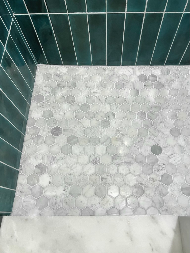 I’ll call this week to be the “telephone hold music” of the One Room Challenge – I am excited to share our new bathroom. I can take credit for the design, but not the construction. There’s also a small DIY project in there! In the meantime, I promise I am working away on other projects for decorating our new bedroom addition, including a custom daybed.