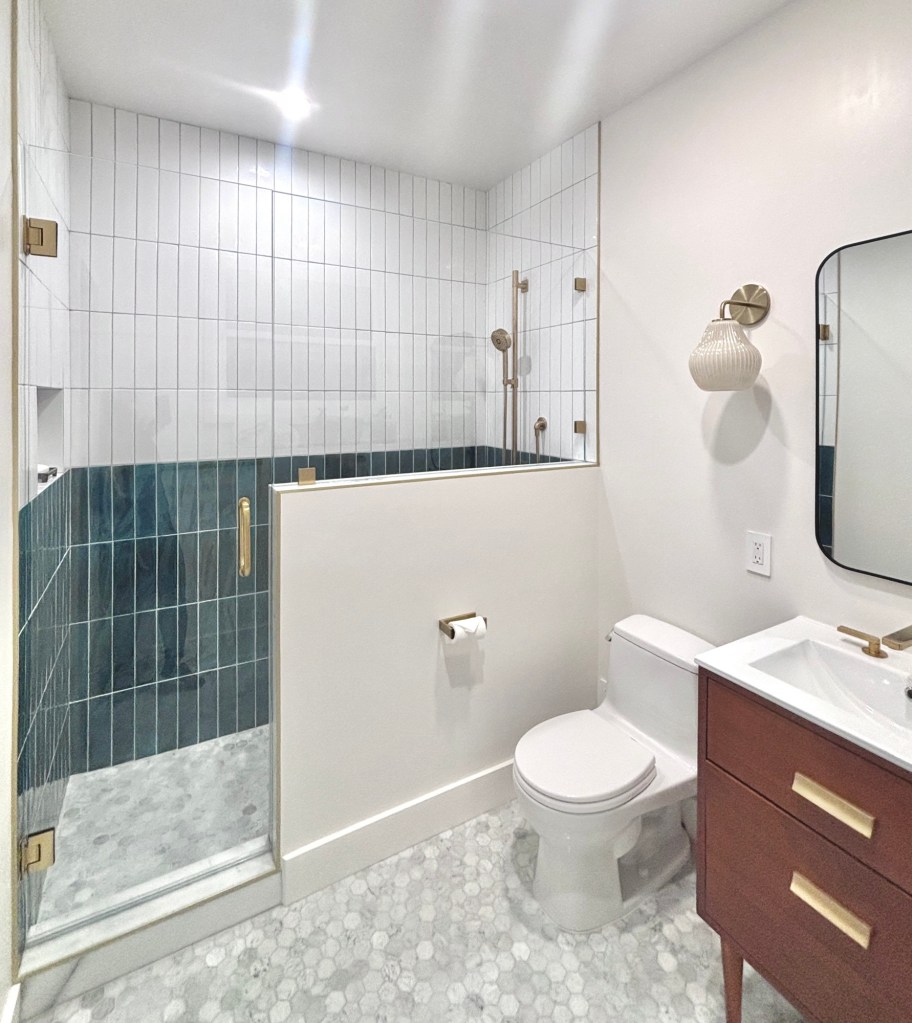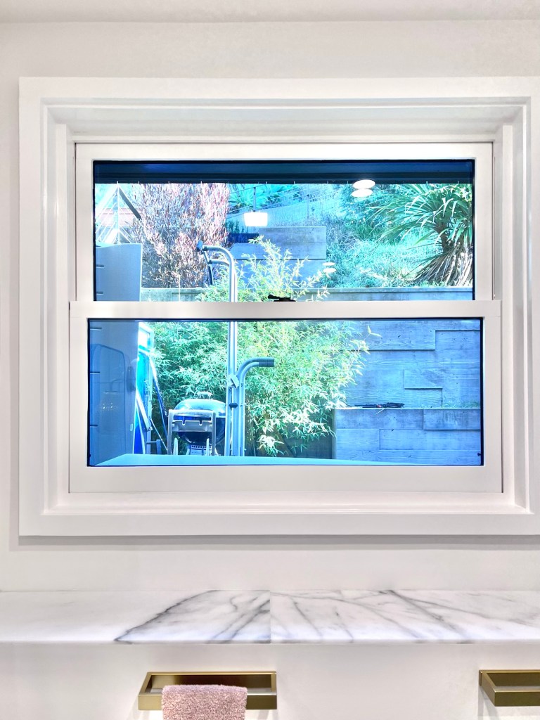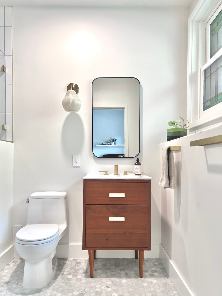 While I left the bathroom construction to our contractor, I did add a DIY touch with the window glass film. There are so many options for window film, so you can have fun browsing for your own favorite. The one that spoke to me for our space is the gingko-themed stained glass from Asgerart on Etsy. It was easy to apply and adds style and much-needed privacy to our little bathroom! To fit our windows, I used two panels side-by-side.