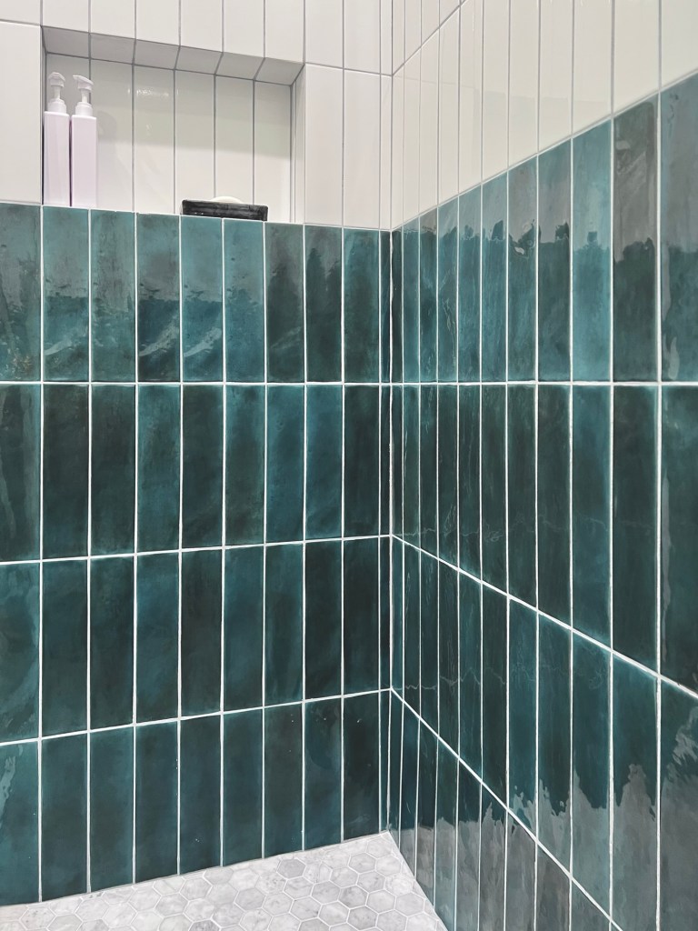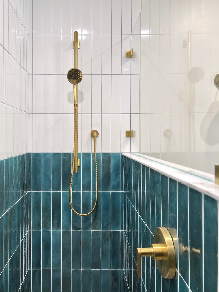 Over time, while we were waiting and waiting for building permits, my plan evolved to be more modern and more green. One of my major inspiration spaces was the Woodlark Hotel in Portland, where we enjoyed a stay a few years ago. From that space (left picture below). I was inspired by the elongated subway tile, stacked vertically, the mix of white and dark green tile, and a mix of black metal and antique brass. This led to my final design (right picture below):