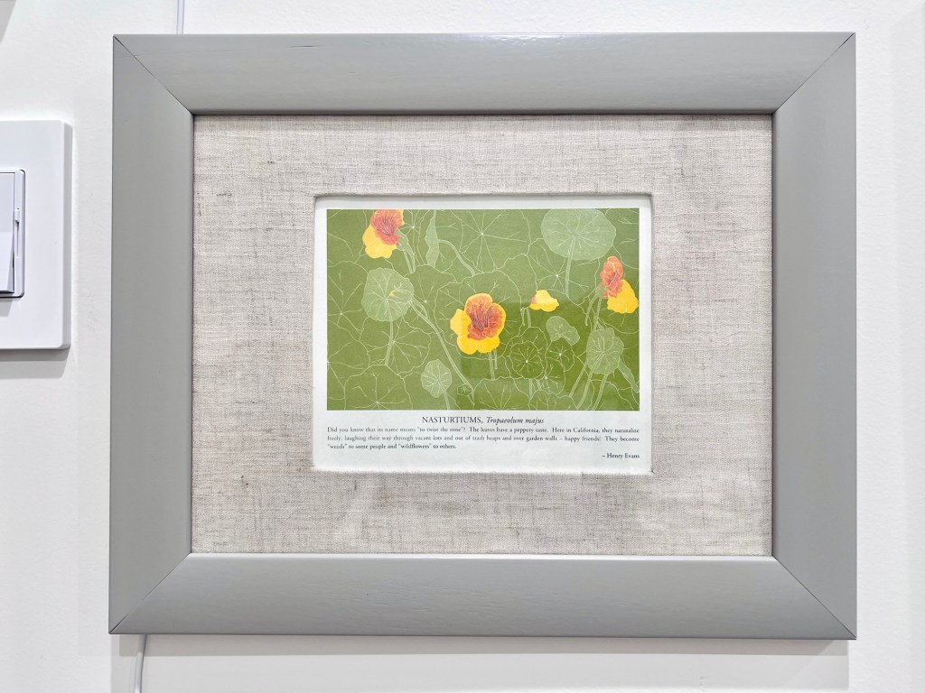 As I said, these walls can talk! Clockwise from left, a photograph taken from Fort Point, under the Golden Gate Bridge, that Steve and I bought at an art fair ~25+ years ago; an LED sign with my son’s name that my sister sent from Hong Kong; a small canvas print of a photo I took, featuring spring blossoms and Victorian houses; photo of Finn I took and printed; nasturtium print by Henry Evans calendar under a DIY fabric mat. My friend Penny gifts me a Henry Evans calendar every Christmas!