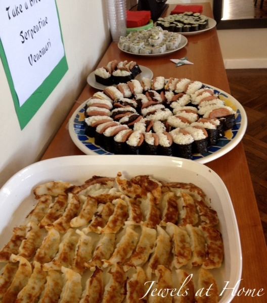 For lunch, we had a variety of Japanese and Japanese-inspired fare, including California rolls and avocado rolls from the local supermarket, homemade Spam musubi by Steve, and plenty of gyoza dumplings, which were the kids’ favorite.