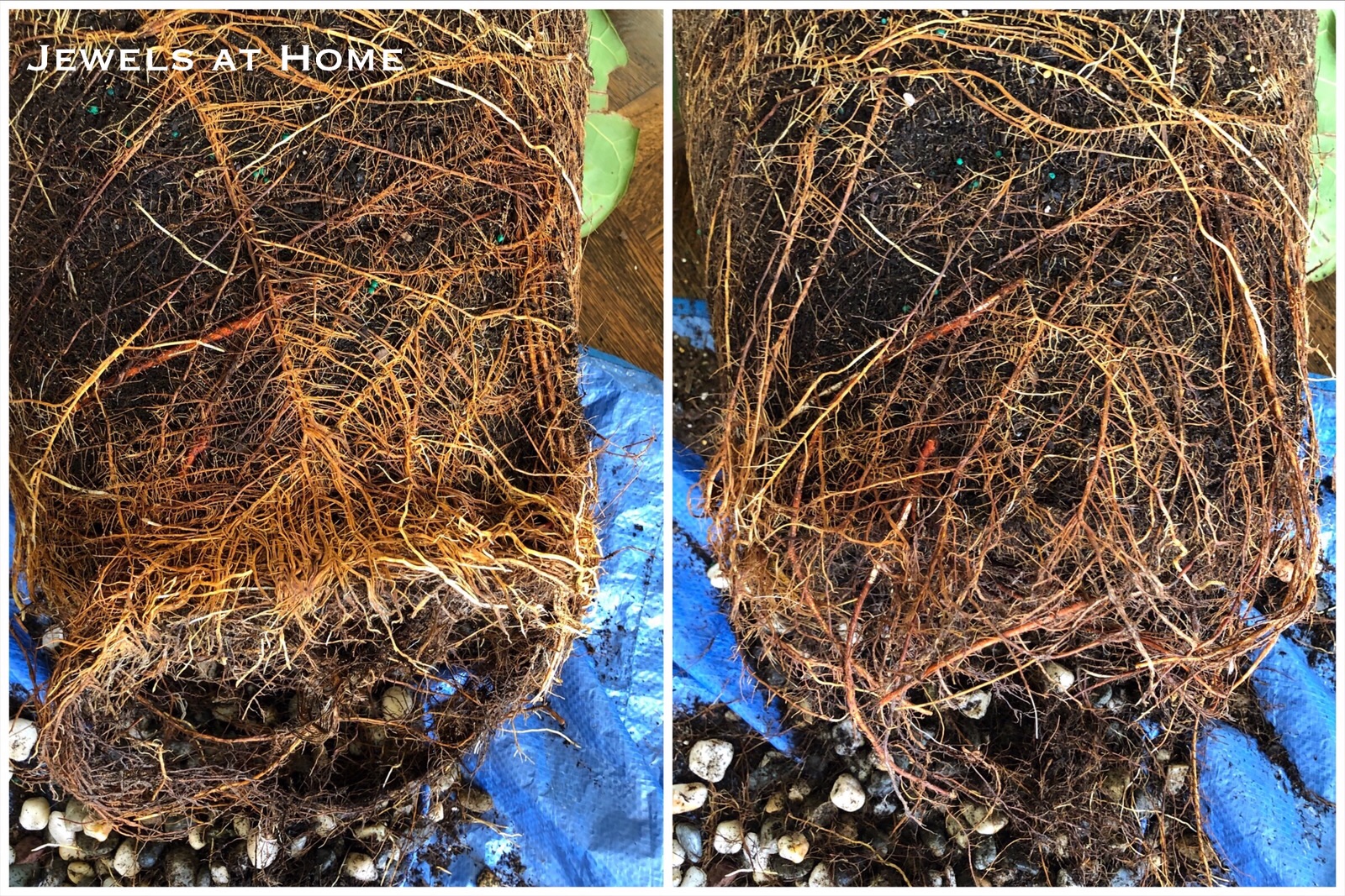 If the roots are really matted and tight (left picture below), you can gently loosen and trim them (right picture below). If you can’t or don’t want to use a larger pot, you can also gently trim the roots, brush off as much of the soil as possible, and use the same pot, though this might limit your plant’s growth overall. I’ve just put my biggest two plants into 24″ diameter pots, which I think is as big as I’ll go, so I’ll need to try just trimming the roots next time. I had to look in a few places before finding this size at Flowercraft in San Francisco.