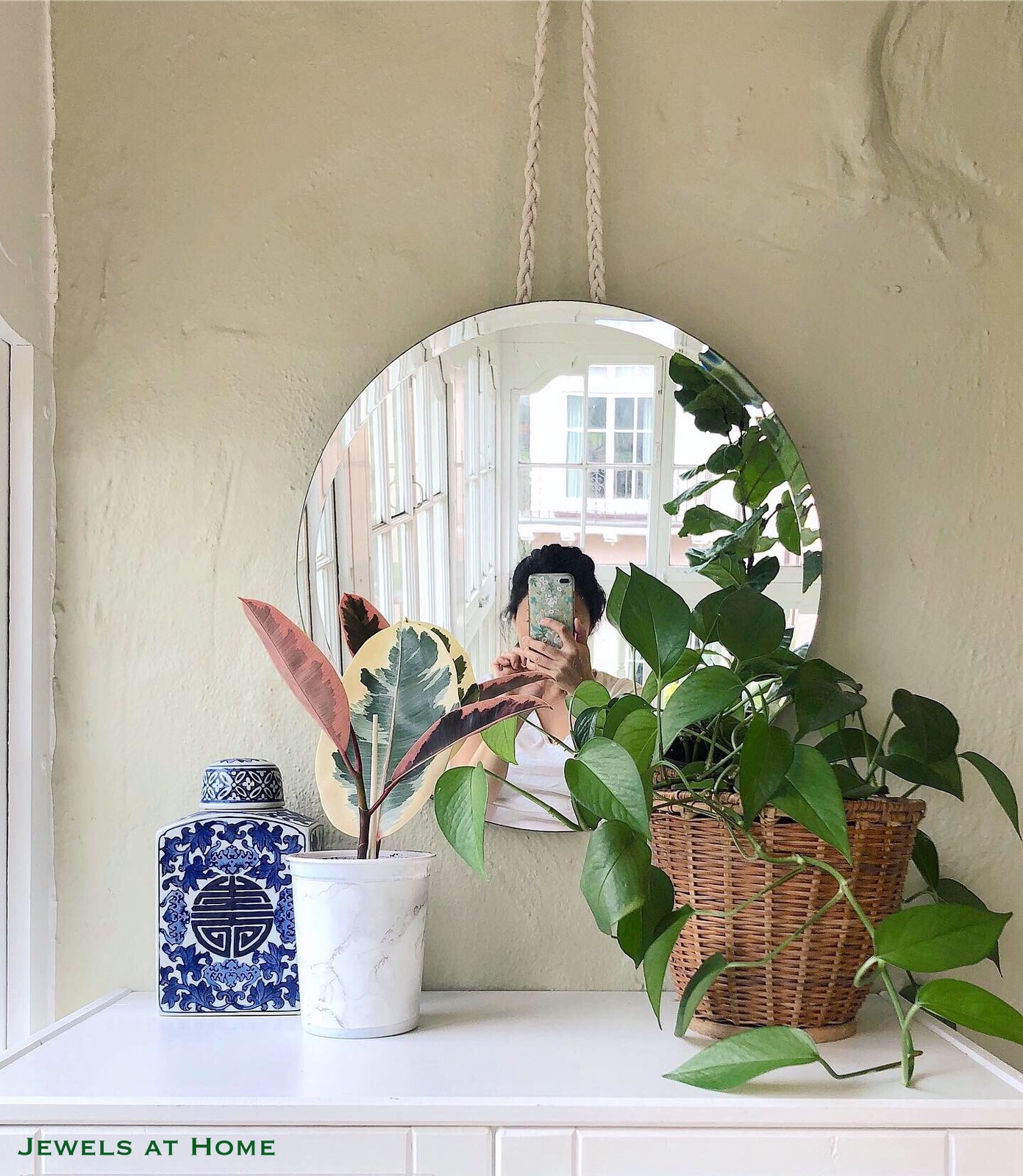 We’ve had this round mirror for a while, and it’s a bit small for where it was hanging before, but it works perfectly here. The walls in this room are crazy hard to drill into (which makes sense, because they are actually exterior walls), so I braided some rope from my macrame days and hung it from a hook in one of the ceiling beams. I like how it adds to the outdoorsy, bohemiam vibe in here!