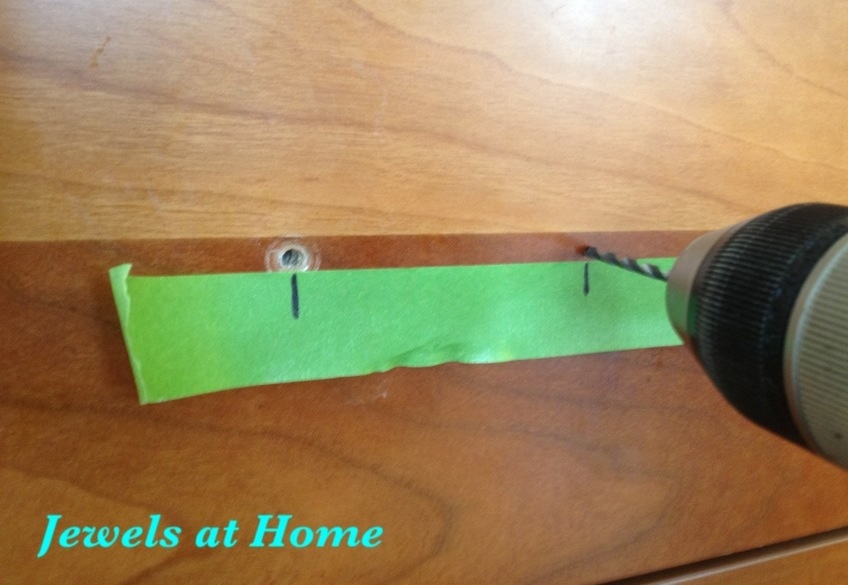 Since the new pulls need two holes, I had to drill new ones. TIP: I used a piece of a piece of painter’s taped marked with the distance between the holes, so I could quickly measure and drill.