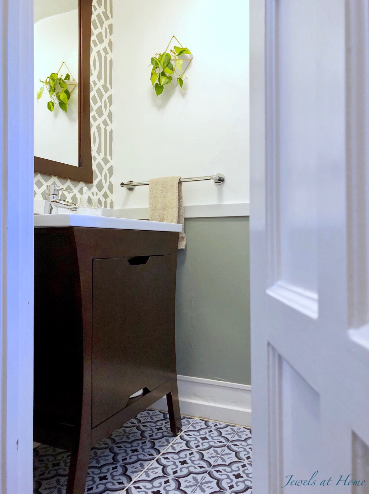 While I left the bathroom construction to our contractor, I did add a DIY touch with the window glass film. There are so many options for window film, so you can have fun browsing for your own favorite. The one that spoke to me for our space is the gingko-themed stained glass from Asgerart on Etsy. It was easy to apply and adds style and much-needed privacy to our little bathroom! To fit our windows, I used two panels side-by-side.