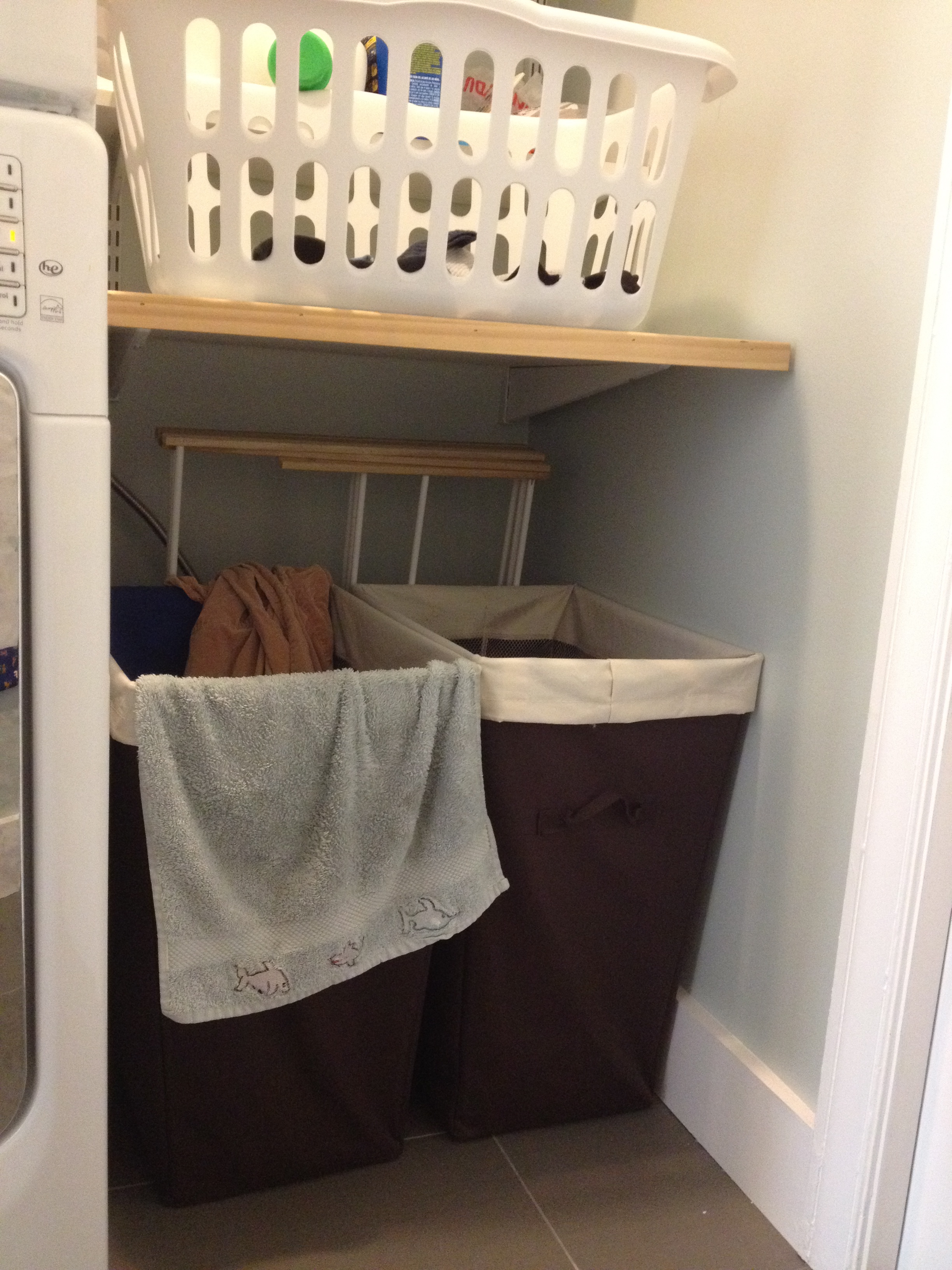 - Hampers for dirty clothes – I like to have separate ones for colors and whites, which makes starting loads easier, though we occasionally get things reshuffled by our toddler!