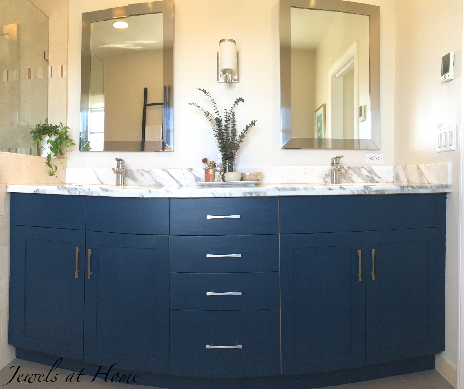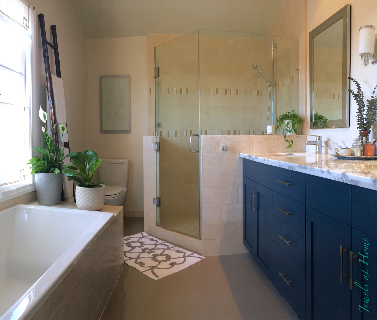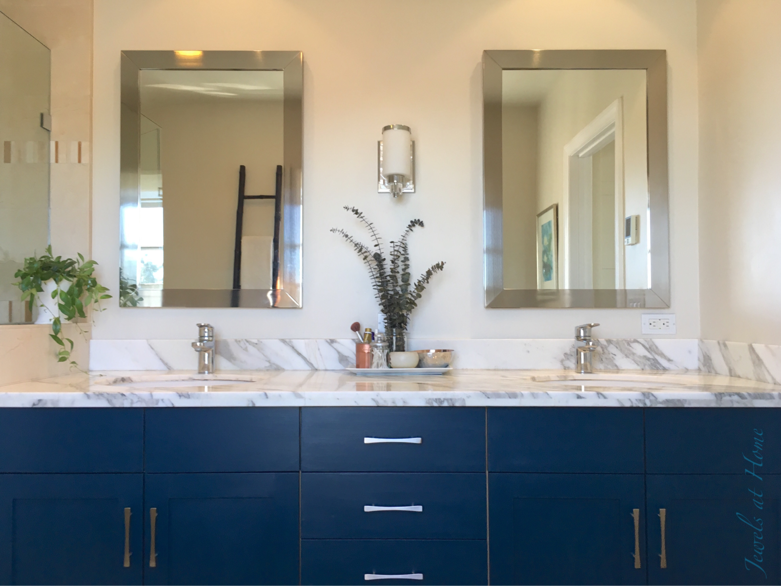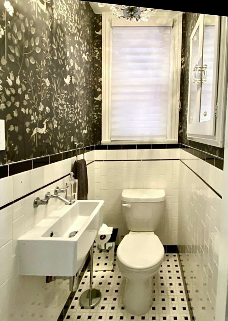 Finally, I decided to go with this beautiful print, the Ronald Redding Aspen wallpaper in dark blue. I love the mix of classic and whimsical and the dark teal blue color with light brown accents that will be brought out by the wood cabinet and the brass coat hooks. I knew it was meant to be when I realized that this is the same pattern that was in the powder room of our rental house. I always loved it, and I am very sentimental , so it makes me really happy to have that connection between the two homes.