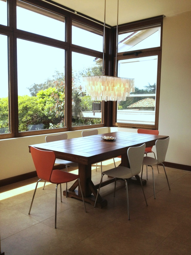- The modern lacquered chairs contrast with natural materials in the table, chandelier, and window trim.