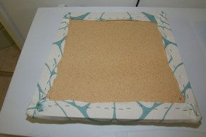 4. Using the staple gun, tack the fabric onto the seat bottom on the center of each side. (Apparently, I forgot to take a picture of this!)