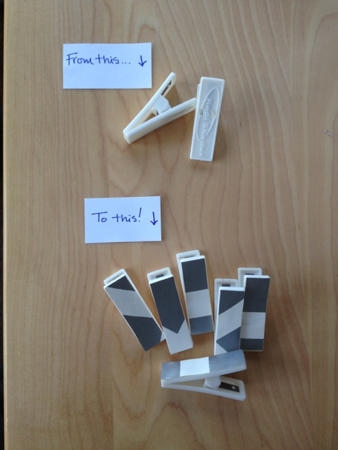 I started with plastic clips leftover from the temporary shades we had everywhere when we moved in. They are great for this project, because they are small and lightweight. The spring is not as strong as a clothespin, which makes them easier to use when attached to a surface.