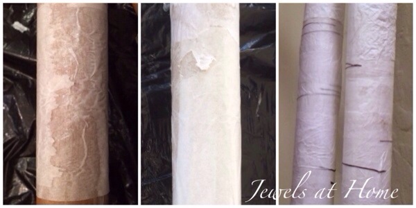 Next, I started creating the look of birch bark, inspired by instructions on making fake birch bark over at Kitsch Designs. The first step is to cut the tissue paper into strips – I made a variety ranging from about two to four inches wide. Then, paint some Mod Podge on the cardboard and wrap strips of tissue paper around the tube (pictured below). I overlapped the paper in places and left gaps in other places, to give a textured look to the branches.