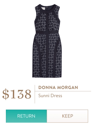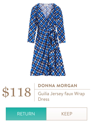2. Donna Morgan Guilia Jersey Faux Wrap Dress. These two dresses definitely prove that you have to try clothes on to really tell what will work. I did not love this dress at first sight. The print was too much of a statement for me, and I thought I wanted something more refined-looking. However, when I put it on, it fit so perfectly, and the style and print are super-slimming. My stylist Erin suggested wearing this with a short trench coat, so I tried it with both a beige blazer and a grey cardigan. Both did a nice job of toning down the print a bit. I had to sleep on this decision, but in the end, I am excited to keep this dress. One of the main reasons I signed up for Stitch Fix was to get introduced to new styles that I would not pick out myself, and I think this dress definitely achieves this.