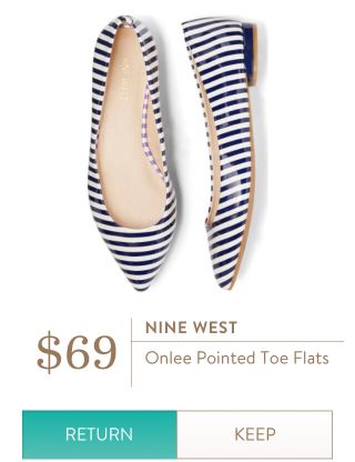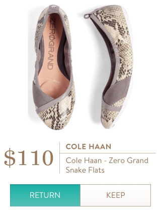 3. Cole Haan Zero Grand Snake Flats. These are actually nice shoes. Cole Haan has good quality shoes, and these are very comfortable, with a bit of a sporty sole. I like these, but I didn’t keep them, because I have a gazillion ballet flats already, and these were a bit expensive for something that is very similar to other shoes I own.