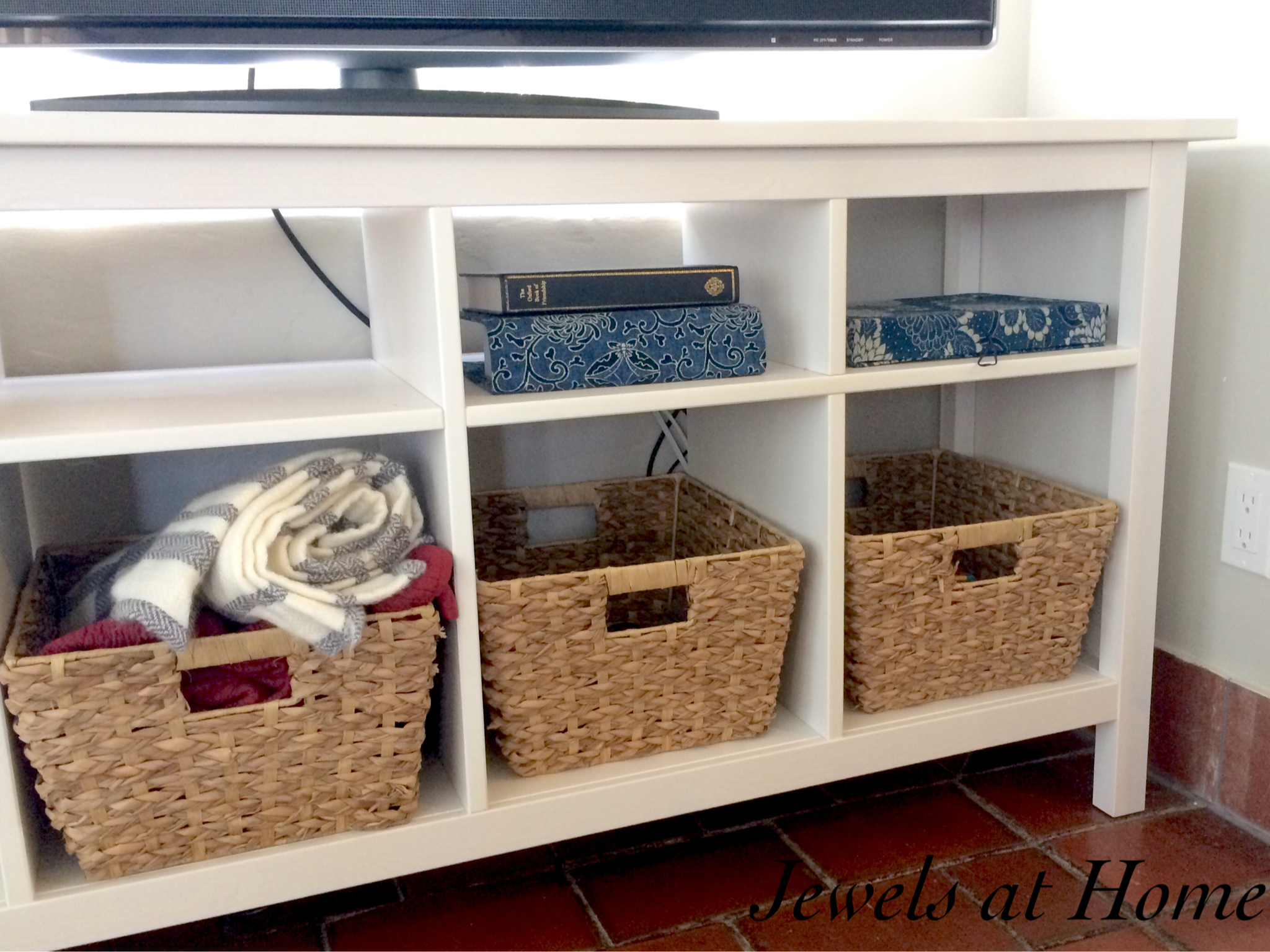 I already made a fabric-covered box to hide our chargers. Next, I turned a book into a neat cover for the computer that sits under our TV.