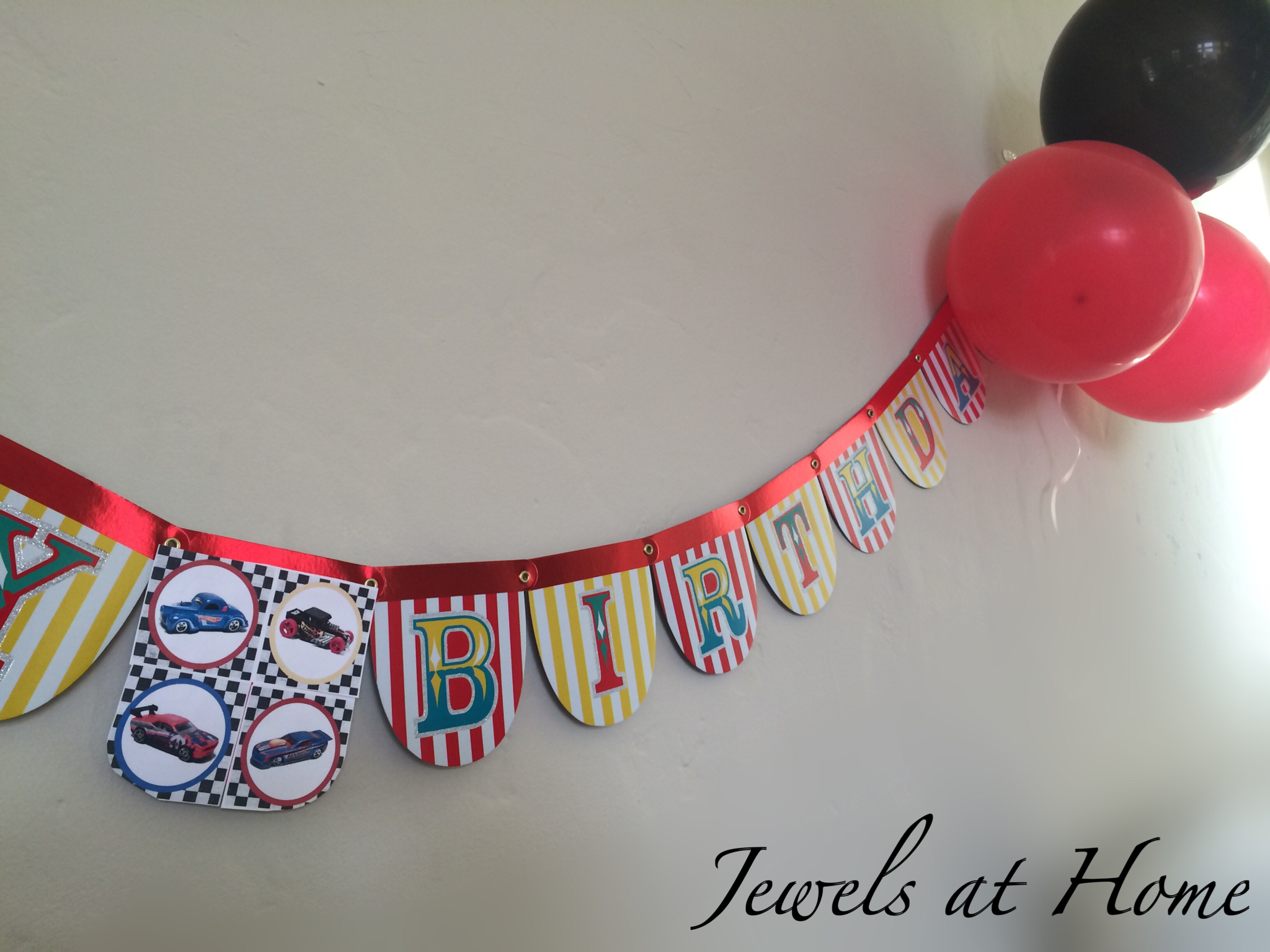 Decorations: To set the theme, I decorated our house with balloons and a Hot Wheels birthday banner.