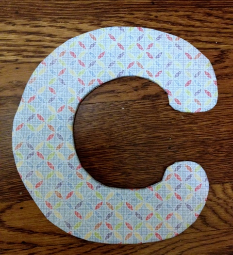 2) Apply paper or fabric: This is where you could get creative and use scrapbook paper, wrapping paper, maps, photos, fabric, whatever! I would recommend cutting leaving a one inch margin around your letter – I didn’t have that much, because I was using a scrap leftover from decorating the back of our little guy’s bookcase, which made it harder. Also, if you are using corrugated cardboard, I would just put a couple of spots of glue from a glue stick on the front, because if you glue it down thoroughly, the corrugation will show.