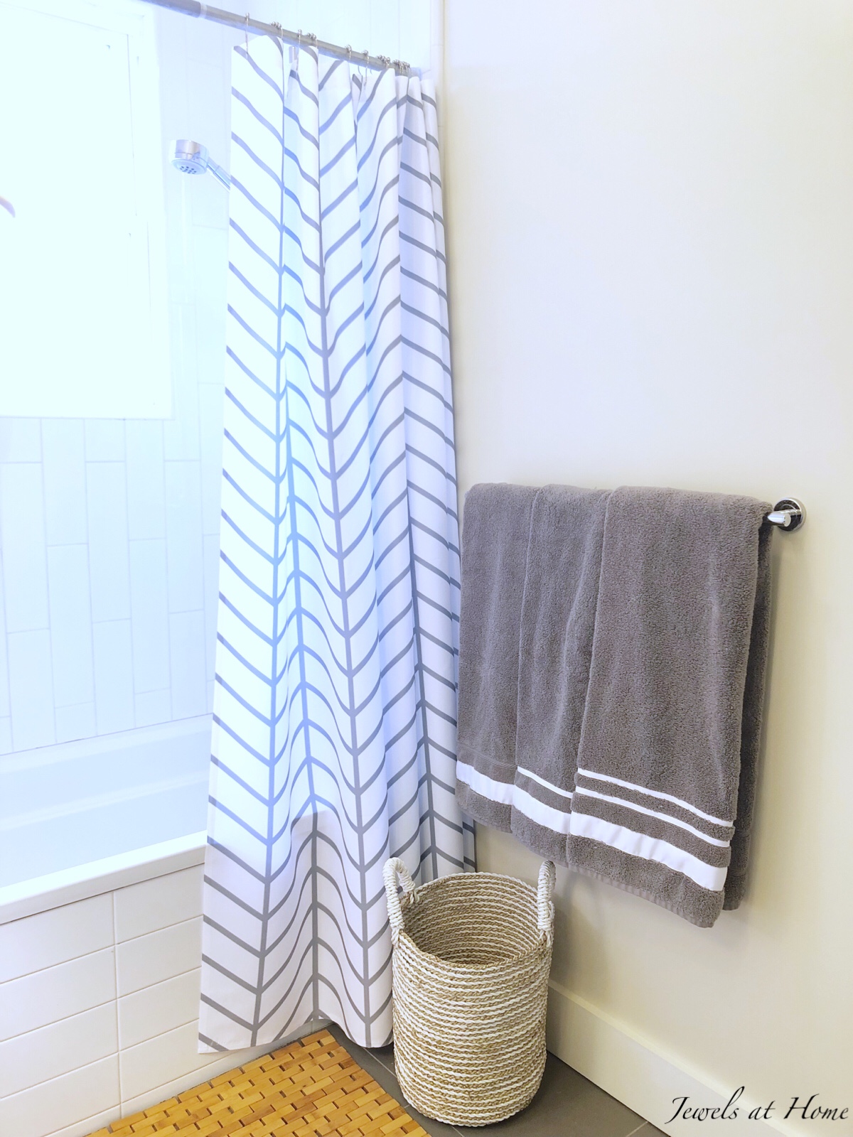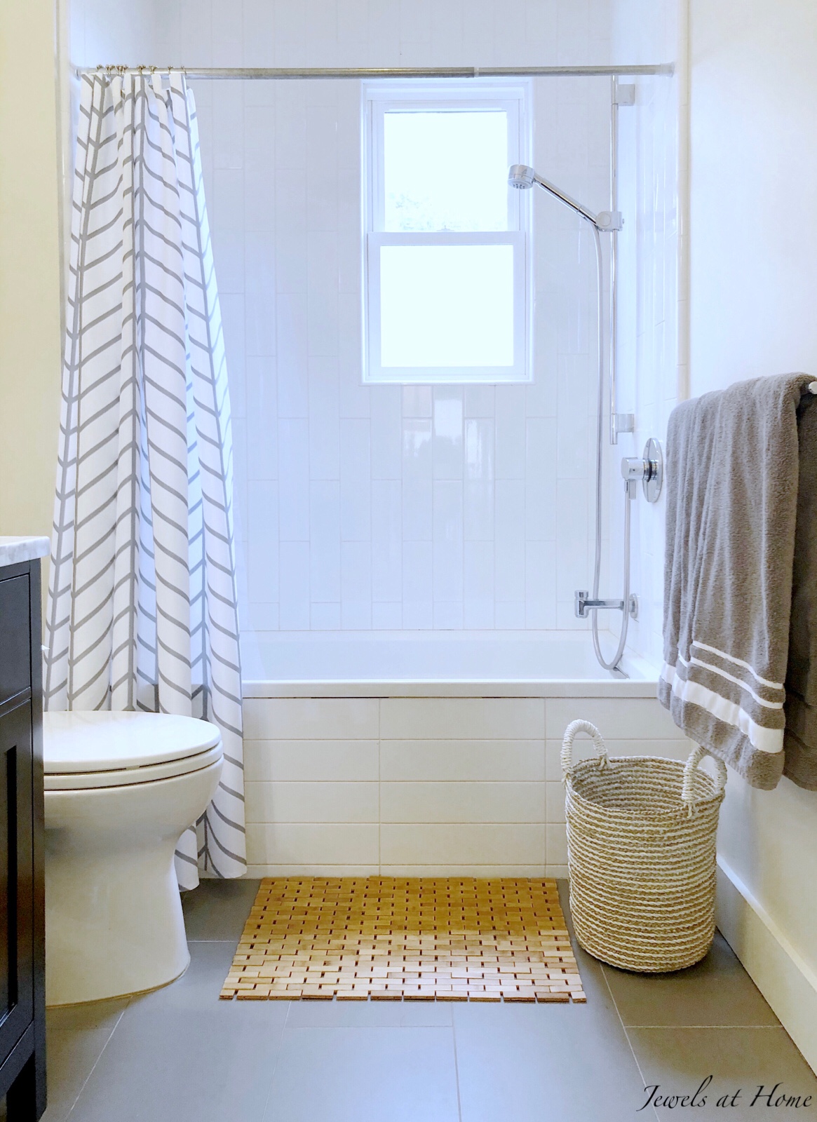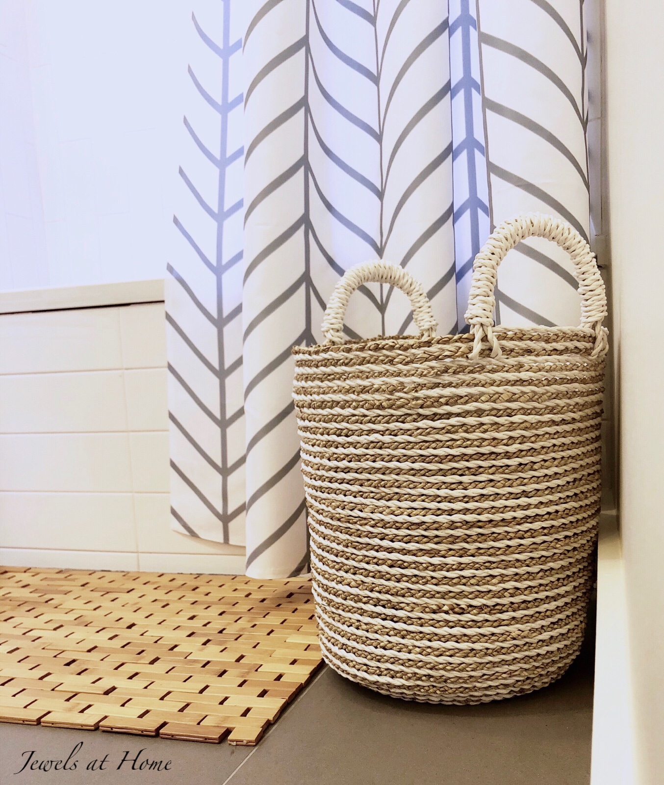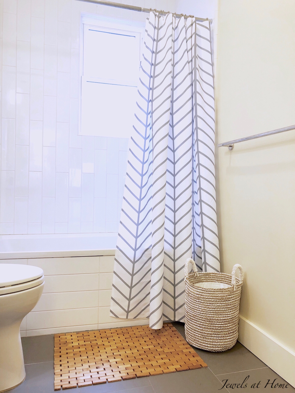 I knew I wanted to bring some natural wood into this room. While I loved the spa-like look of slatted teak mats, I was afraid that the kids would stub their toes in the middle of the night, because our bath mat sits right in front of the toilet. I settled for this low profile flexible bamboo mat, and I’m happy with the results!