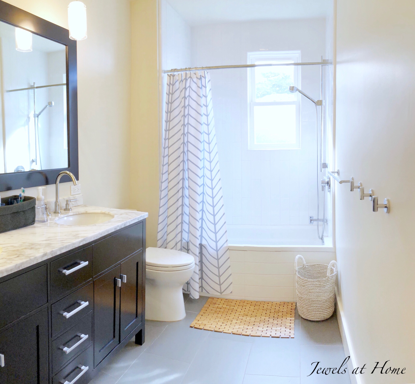 I’m really excited to be a Guest Participant in my first One Room Challenge! This is a great way to get inspiration and motivation for your home. For this challenge, I’ve decided to re-do our kids’ bath. It started out with a cute beach theme that seemed perfect when the boys were little, but now I am ready for it to grow up with them. Our new look features neutral colors, natural touches, and enough personality to stand up to three boys! Thanks for following along!