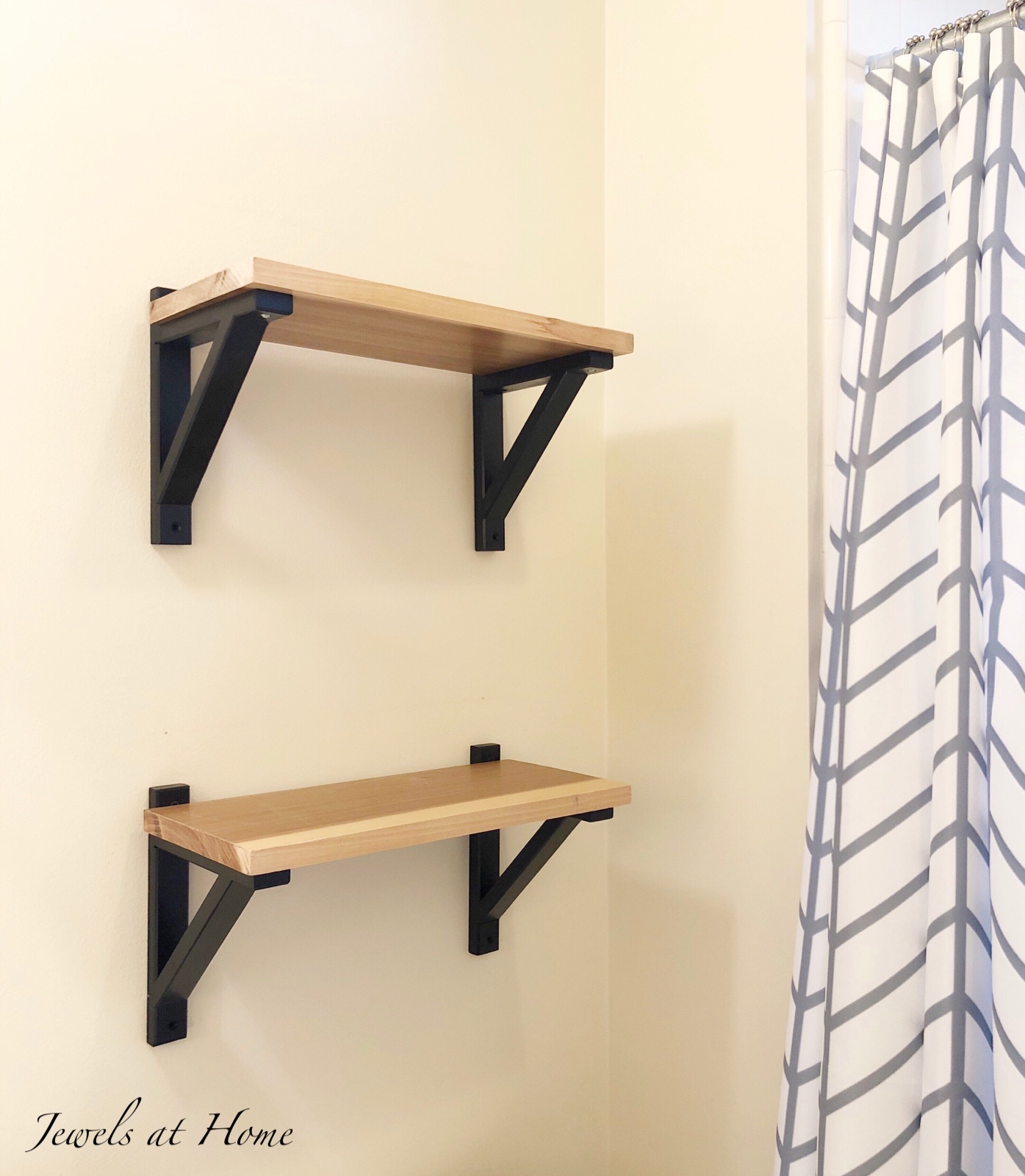 I mentioned how I really wanted to bring natural wood into this space, and these shelves help tie things together with the bamboo bathmat and seagrass basket.