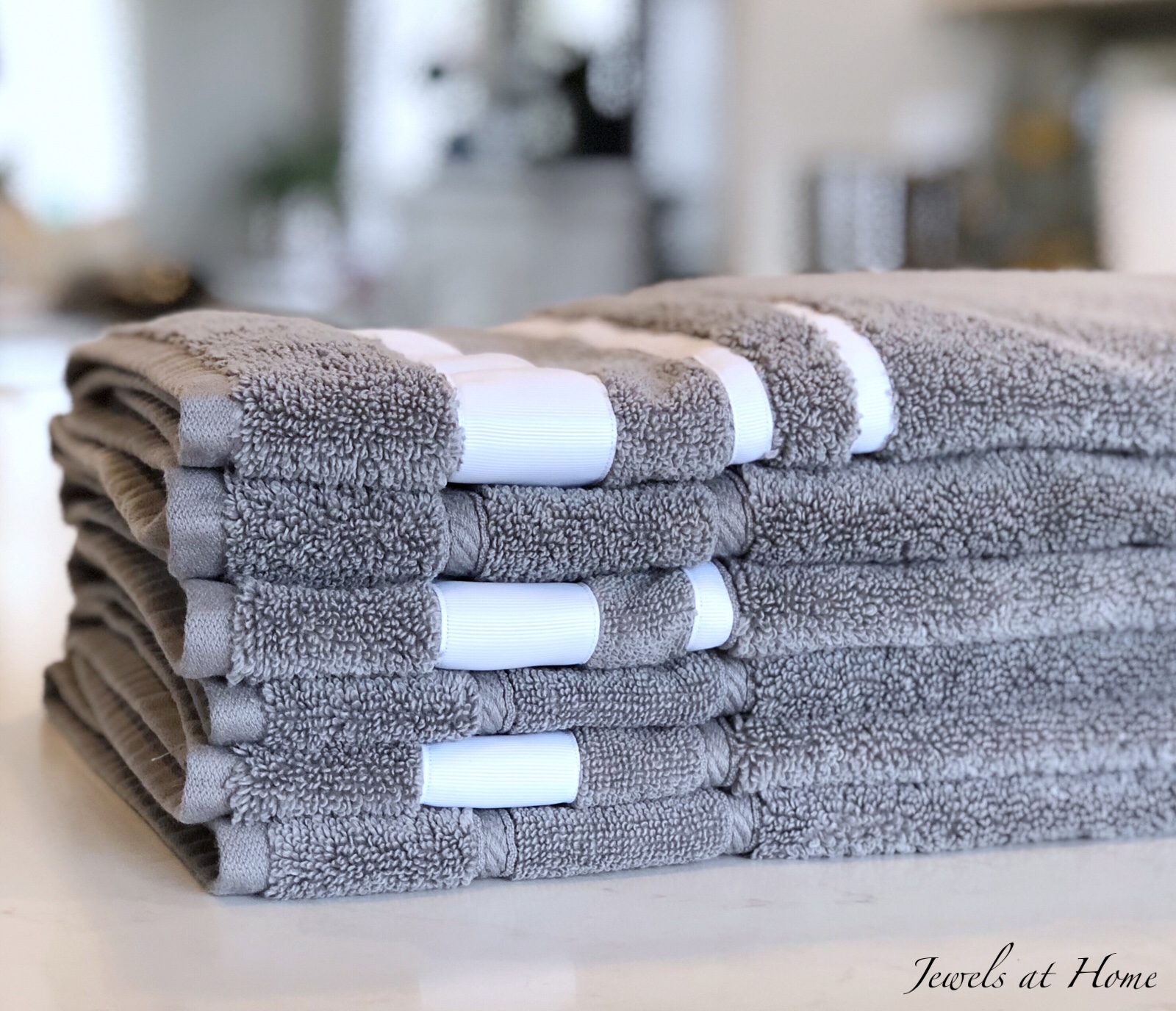Fortunately, I remembered how I had added trim to our master bath towels, so I adapted that project for the boys. I started with solid grey towels and white grosgrain ribbon in 1.5 inch and 5/8 inch widths. I sewed on one stripe for our oldest, two for our middle boy, and three for our youngest.