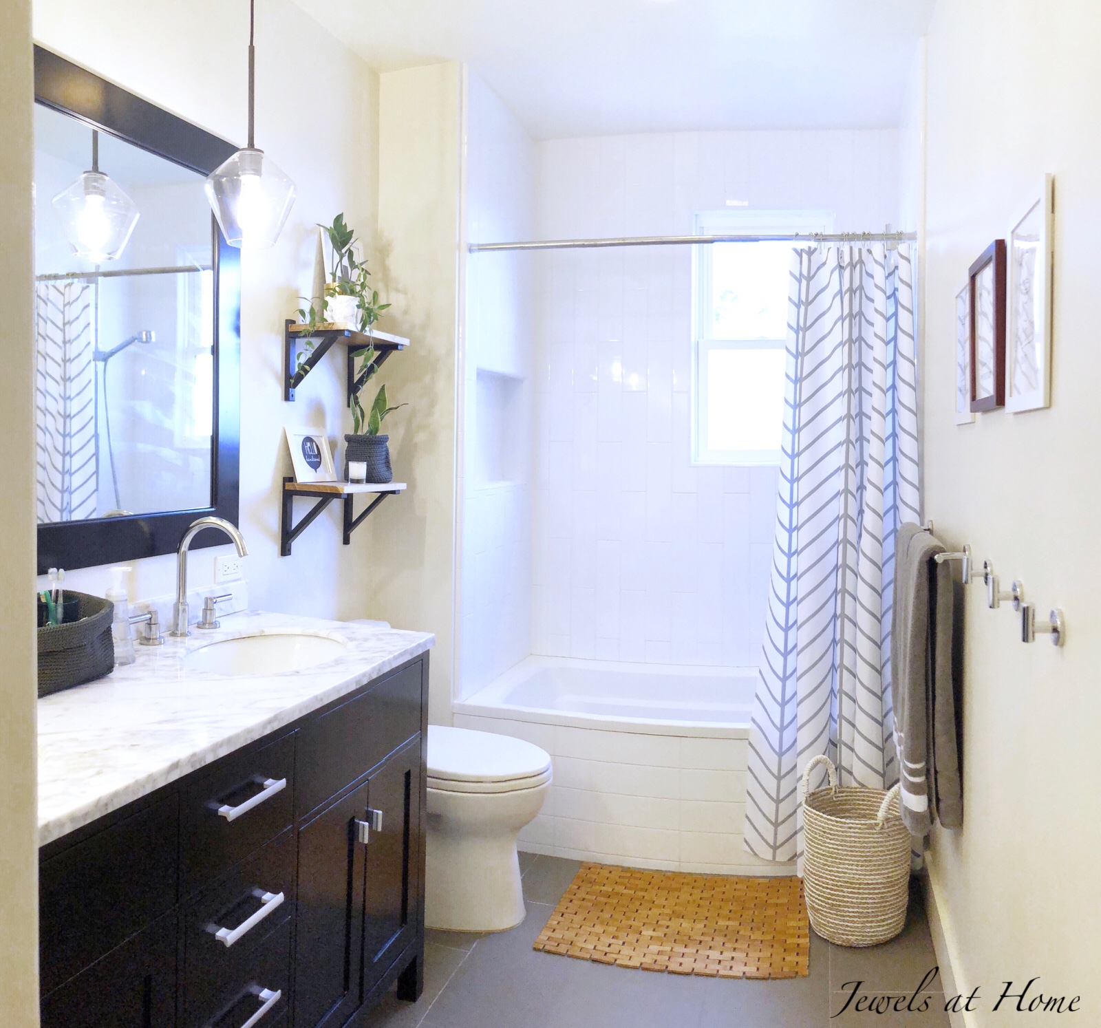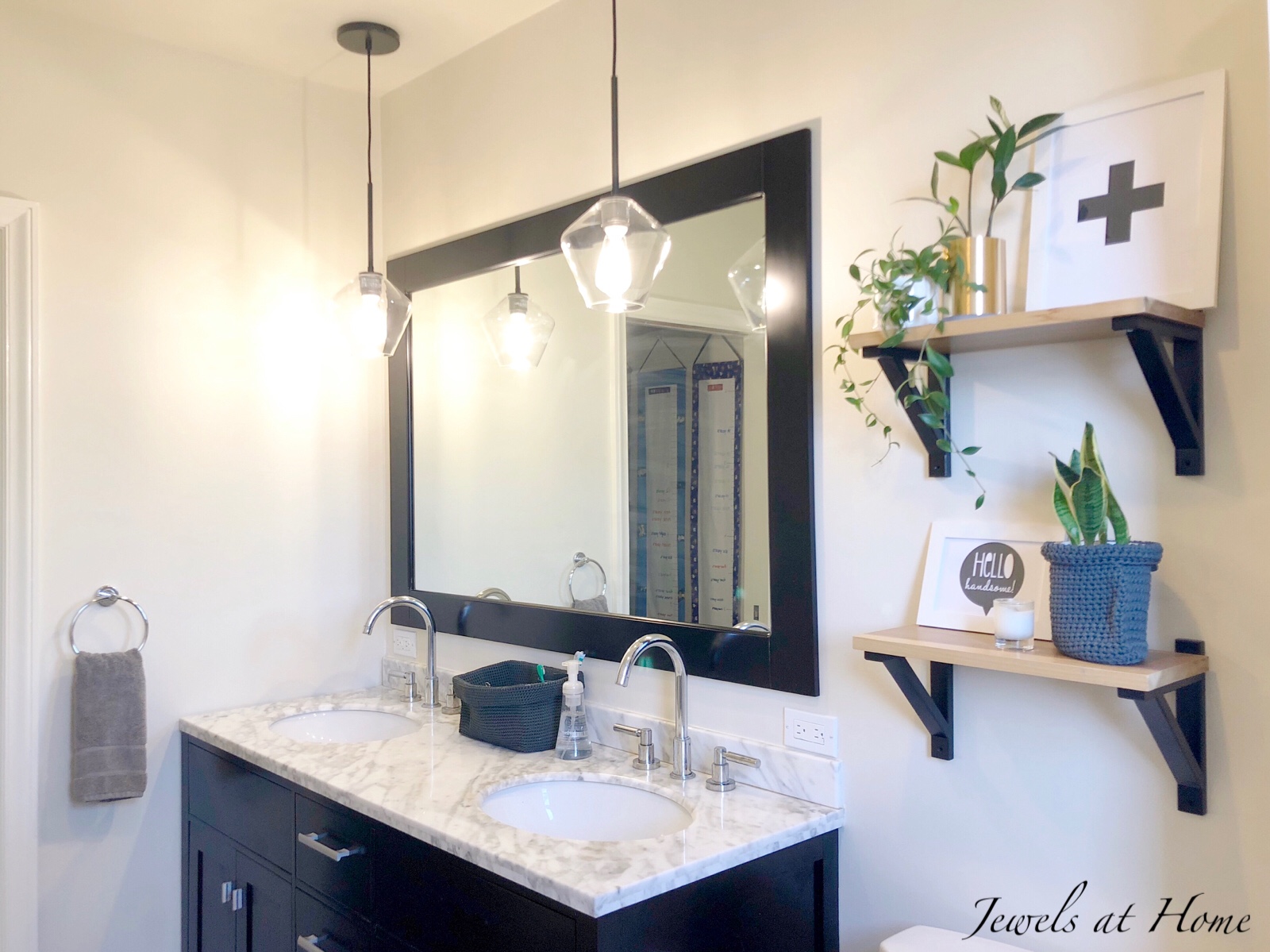Have you noticed that I’ve only been taking pictures of this bathroom from one side? Yes, it’s a small room, but I’m not too proud to stand in the bathtub or behind the toilet to get a good picture, like when I redecorated our master bath or our powder room! The reason I’ve been taking pictures from just one side is that one of the pendant lights over the vanity was broken, and both of them were originally hung too high. Finally, almost seven years after we renovated this bath, I’m finally really happy with the pendant lights.