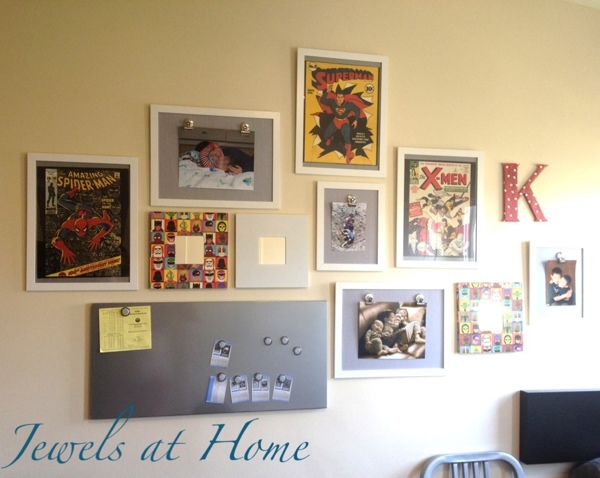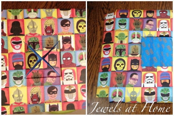 In setting a theme for our tween boy’s new room, I found this fun and colorful Heroes and Villains wrapping paper. I’m using it for some DIY pencil tins and also covered some Ikea Malma mirror frames for his wall.