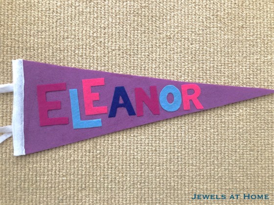 Making pennants for a birthday banner. Cover the paper with clear contact paper, so decorations can be switched out according to the party’s theme.