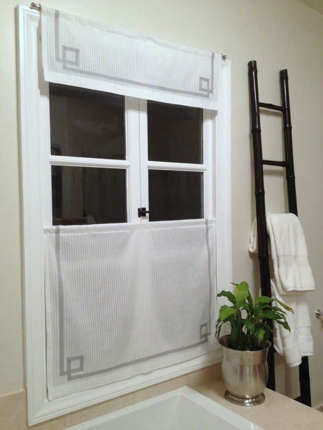 When I bought the roman shades for our master bedroom, I almost ordered one for our bath, too. I’m very glad that I decided to go with something lighter. I ended up making a sheer panel for the bottom half and a matching valance at the top. This gives privacy while still letting in light and our view.