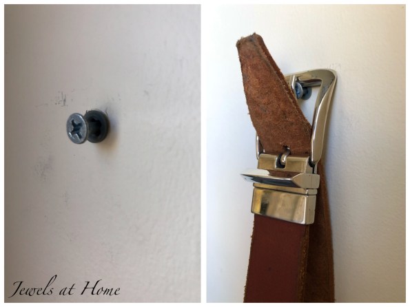 - Put in drywall anchors at the top of the belts and screw in your screw, leaving the screw head out a little bit from the wall