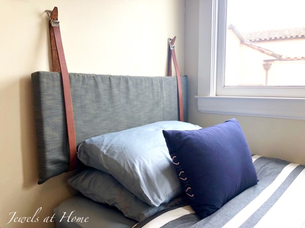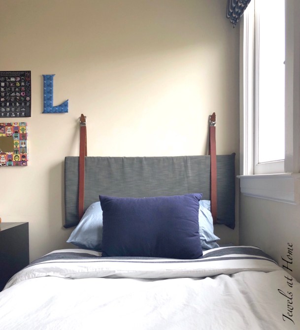 When I first created our tween boy’s room a few years ago, I made a DIY bed from Ikea bookcases, and the headboard was an Ikea floating shelf mounted on its side. These days, this room is home to different tween boy, and it was time for a cozy upgrade to his bed! I was thinking of buying leather straps for this project, but when I was at the Flea Market with my friend Ariana of Act 2 Decor, I saw these vintage belts and loved the idea of doing a twist on this project!